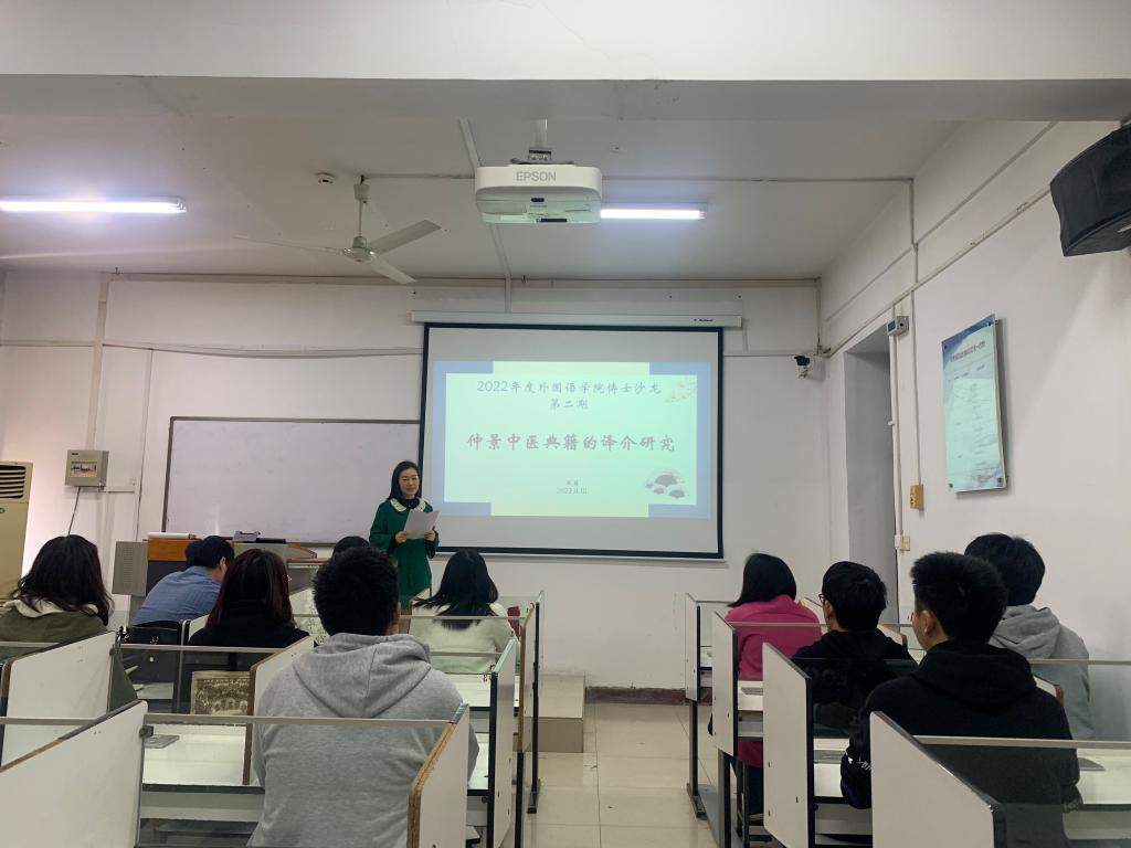 本次活动由外国语学院张莉博士主讲,讲座题目是“仲景中医典籍的译介研究”。首先,张莉以一份科研项目书为基础,分享“仲景中医典籍的译介研究”背景、目的、方法及意义。其中,详细介绍了仲景中医典籍的研究现状及主要研究内容。最后,与会教师及团队成员就仲景中医典籍的研究意义及存在问题、如何完善项目申请书展开热烈交流与探讨。