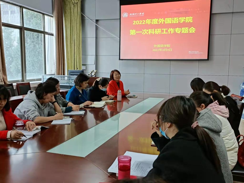 本网讯(通讯员/周小玲)2022年3月4日下午,外国语学院在1215会议室举行本年度第一次科研工作专题会。会议由副院长包相玲主持,院长海霞、外国语学院具有博士学位的教师、高级职称教师及校级科研平台“中原文化译介与传播中心”的成员参与了会议。