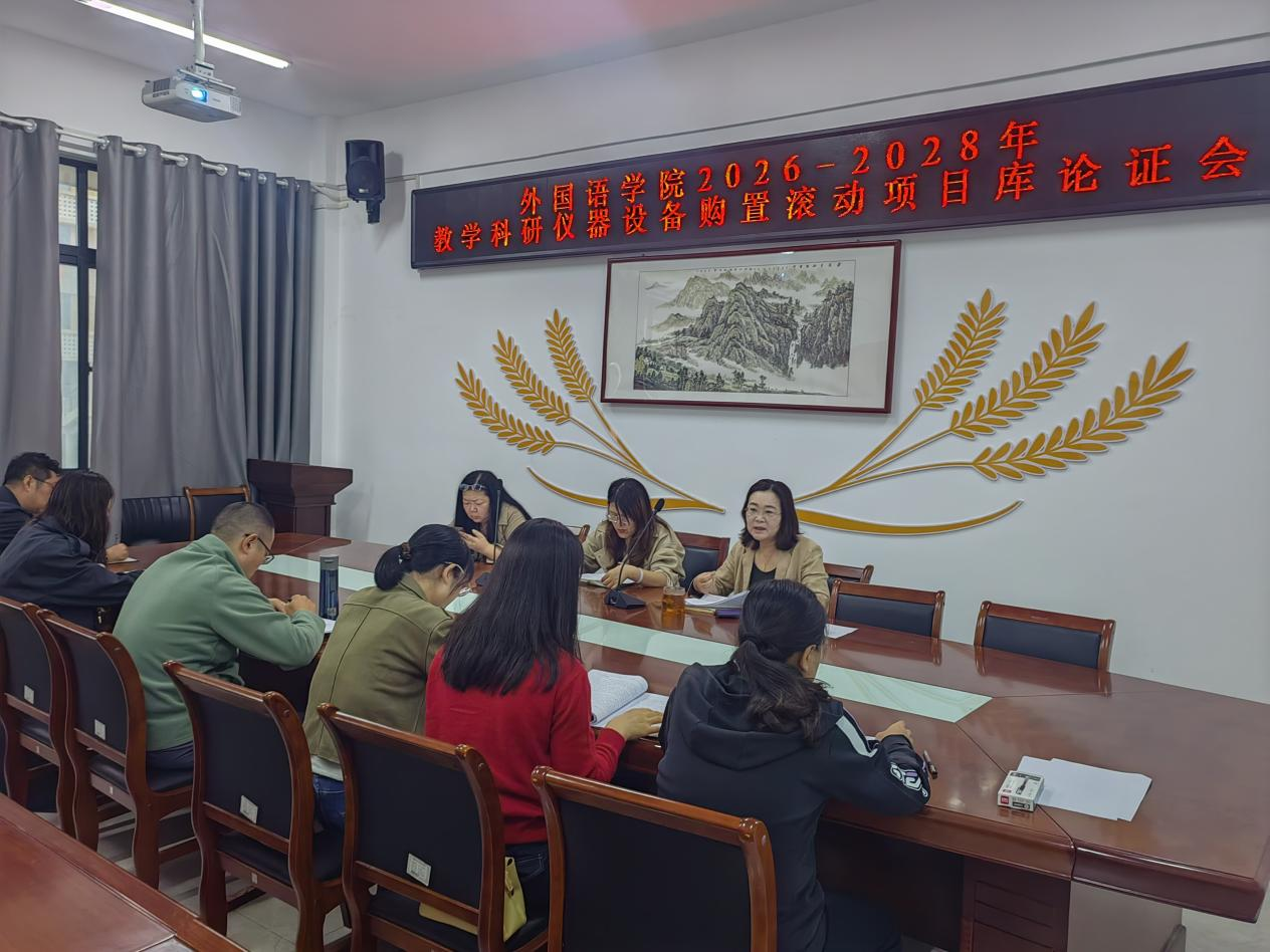 本网讯(记者/陈鹏)9月26日上午,外国语学院2026-2028年教学科研仪器设备购置滚动项目库论证会在19号教学楼201会议室召开。论证会采用腾讯会议线上平台与线下相结合的形式,学院副院长包相玲、教研室主任、部分教师代表以及实验中心全体成员参加了论证会。