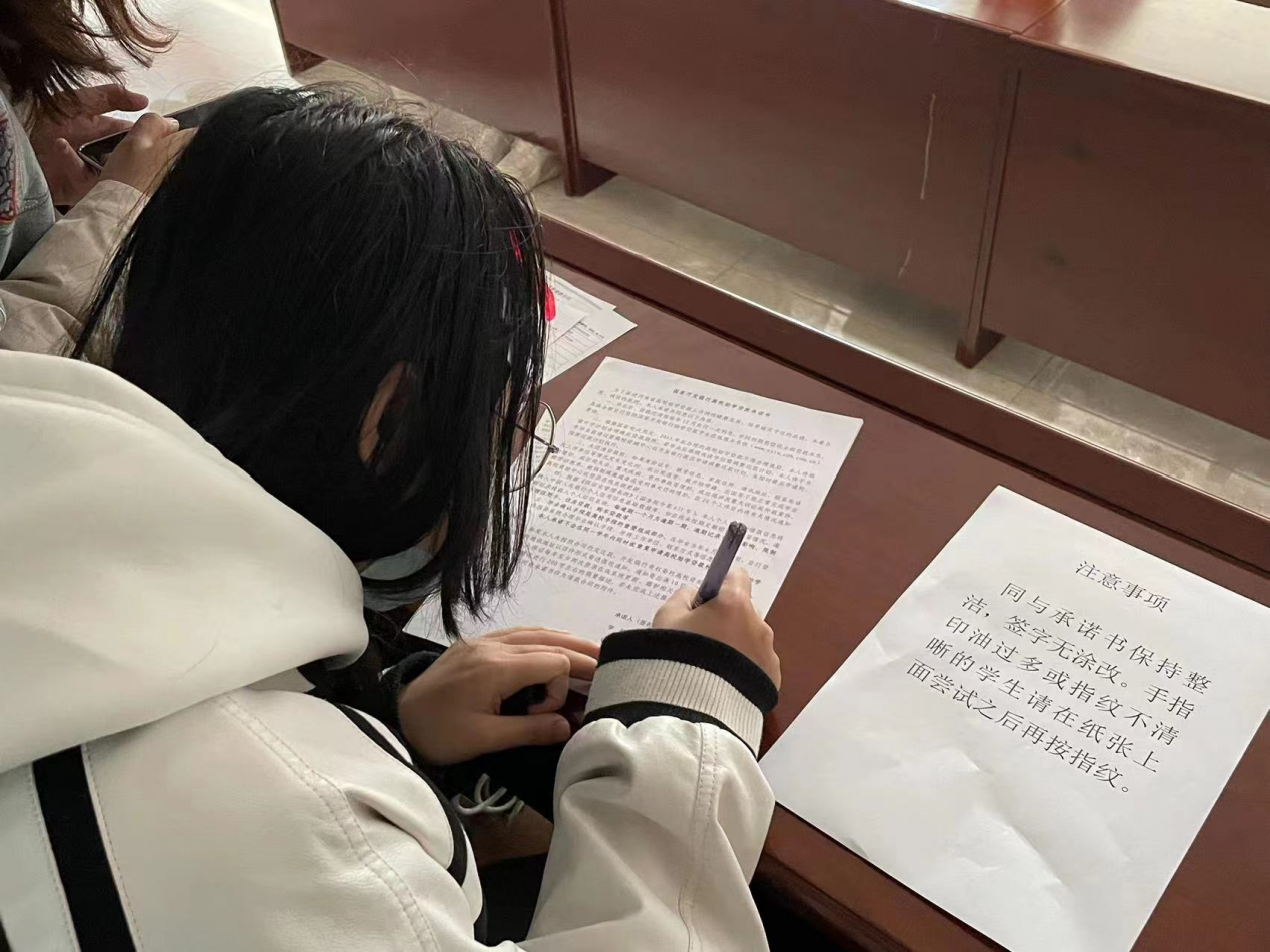 会议伊始,尚明萱向申请助学贷款的学生介绍了国家资助育人政策,并针对贷款注意事项做出详细讲解,耐心解答同学们关于贷款合同内的疑惑内容。随后,尚明萱为贷款学生发放开发银行高校助学贷款借款合同及国家开发银行高校助学贷款承诺书,指导贷款学生签字并按手印。最后,尚明萱提出,同学们要树立诚信观念和感恩意识,诚信贷款,按时还款。