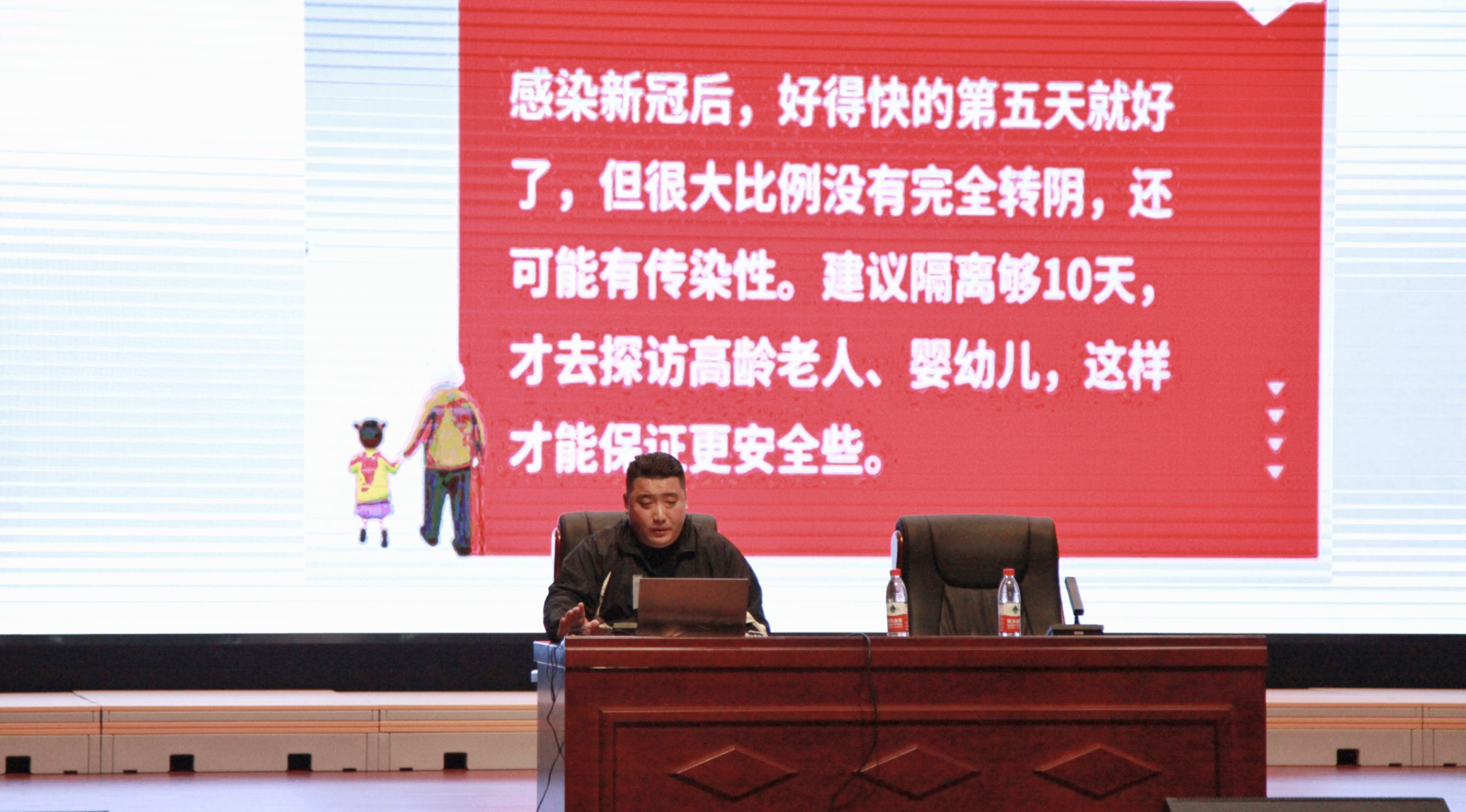 本次讲座围绕”拒绝躺平,一起回归科学运动”为主题展开。讲座伊始,刘晓亮对当前新型冠状病毒放开的大环境、大背景进行讲解,强调增强免疫力的必要性。接着,刘晓亮向同学们讲解新型冠状病毒感染后的缓解方法和注意事项。最后,刘晓亮邀请我校体育老师及同学上台进行伸展运动和健身气功的动作示范,并就“阳康”后如何进行体育锻炼给同学们提出详细指导。