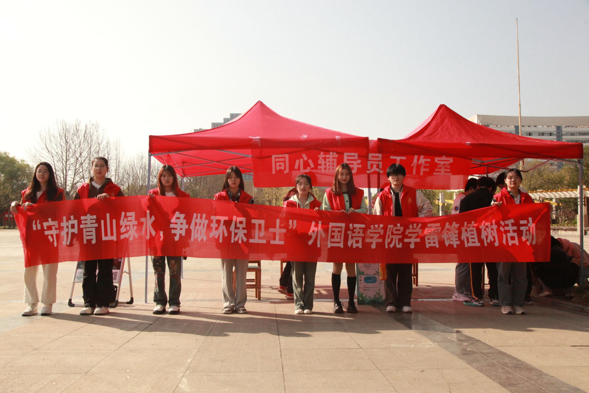 本网讯(通讯员/张凉彦)为进一步推进生态文明建设,弘扬雷锋精神,增强同学们的环保意识和主人公意识,同心辅导员工作室于东南校区齐贤广场开展“守护青山绿水,争做环保卫士”学雷锋植树活动,外国语学院全体同学积极参与。