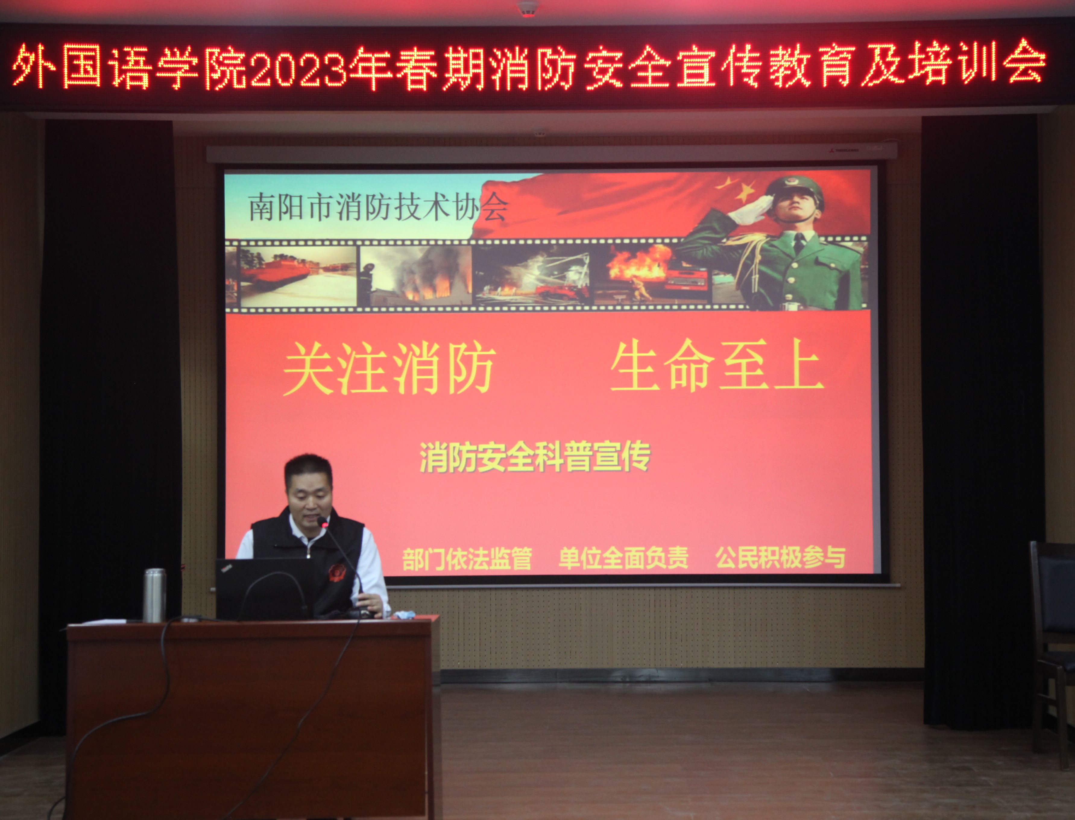 本网讯(通讯员/肖婧宜)为树立防灾忧患意识,提高外国语学院师生应急防灾能力,3月23日,外国语学院于19号教学楼105室顺利举行2023年春期消防安全宣传教育及培训会。本次活动由南阳市消防技术协会的曾教员主讲,外国语学院师生代表积极参与学习。