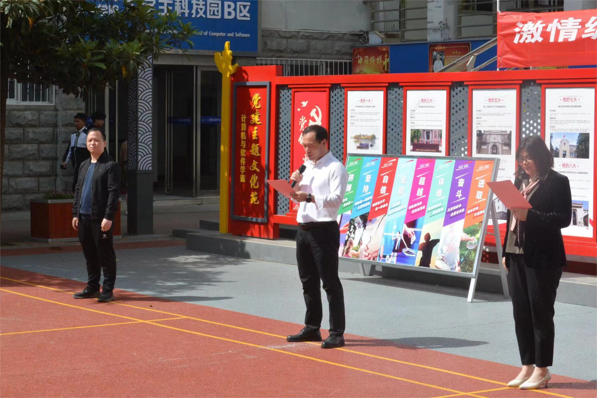本网讯(通讯员/袁艺菲)为加强学生强身健体的意识,丰富学生们的精神文化生活,增强团队凝聚力和向心力,4月16日,外国语学院与计算机与软件工程学院联合举办“激情绽放,羽你共享”羽毛球友谊赛。计算机与软件学院党委书记祝孔涛、副院长邵艳玲以及大学生科技园指导老师陈可出席比赛开幕式并发言。外国语学院体育部全体成员积极参加。