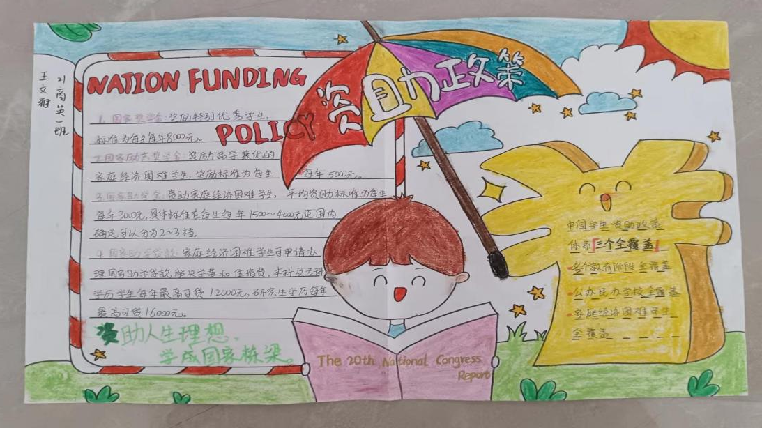 创作理念:该作品主要阐述了国家的资助育人政策。作品中一个形似“钱”的小人为一位正在读书的学生撑伞,如同资助育人政策为我们撑起了一把大伞,给我们带来一份温暖的关心,慰藉了千万学子们的心灵。作为受资助政策帮助的一员,我心怀感恩,特绘制本次资助政策宣传的手抄报,以表达我对国家、社会、学校以及资助政策的感激之情。
