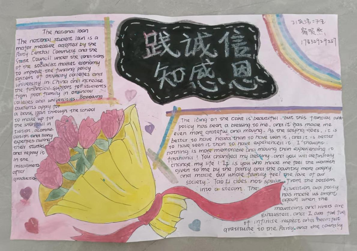 创作理念:该手抄报以“践诚信,知感恩”为主题,具体描述了国家助学贷款的含义和具体内容,并且通过粉色背景图和花束形状展示了国家助学贷款政策给予学生的关怀与温暖。