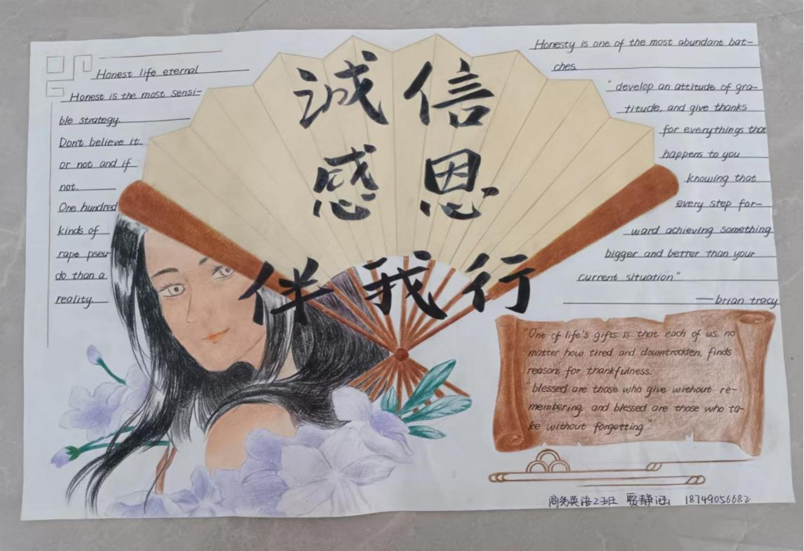创作理念:该手抄报的主题是“诚信感恩”。整幅画面主要是大的中国风的基调,所选择的艺术字也是一个毛笔字的字体,背景板选择了一幅扇子。以扇子为背景,毛笔字相辉映来强调主题,其他的元素如花纹、卷轴也属于中国元素,加上专业所学语言,作品整体通过中外文化相结合的形式向大家展示“诚信感恩”这一主题。