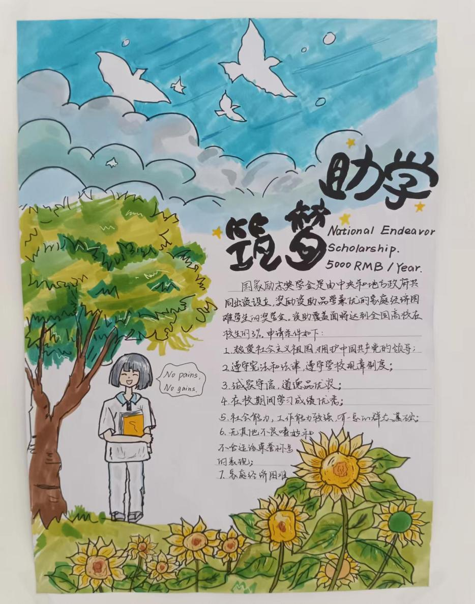 通过结合学科专业特色,开展手抄报宣传活动,以外国语学院学生喜闻乐见的形式,把资助政策宣传、诚信教育、感恩教育等融入到学生日常,普及、宣传国家资助政策知识,引导广大同学深入学习国家资助政策,激励家庭经济困难学生克服困难,励志成才。