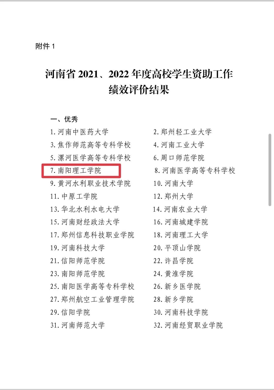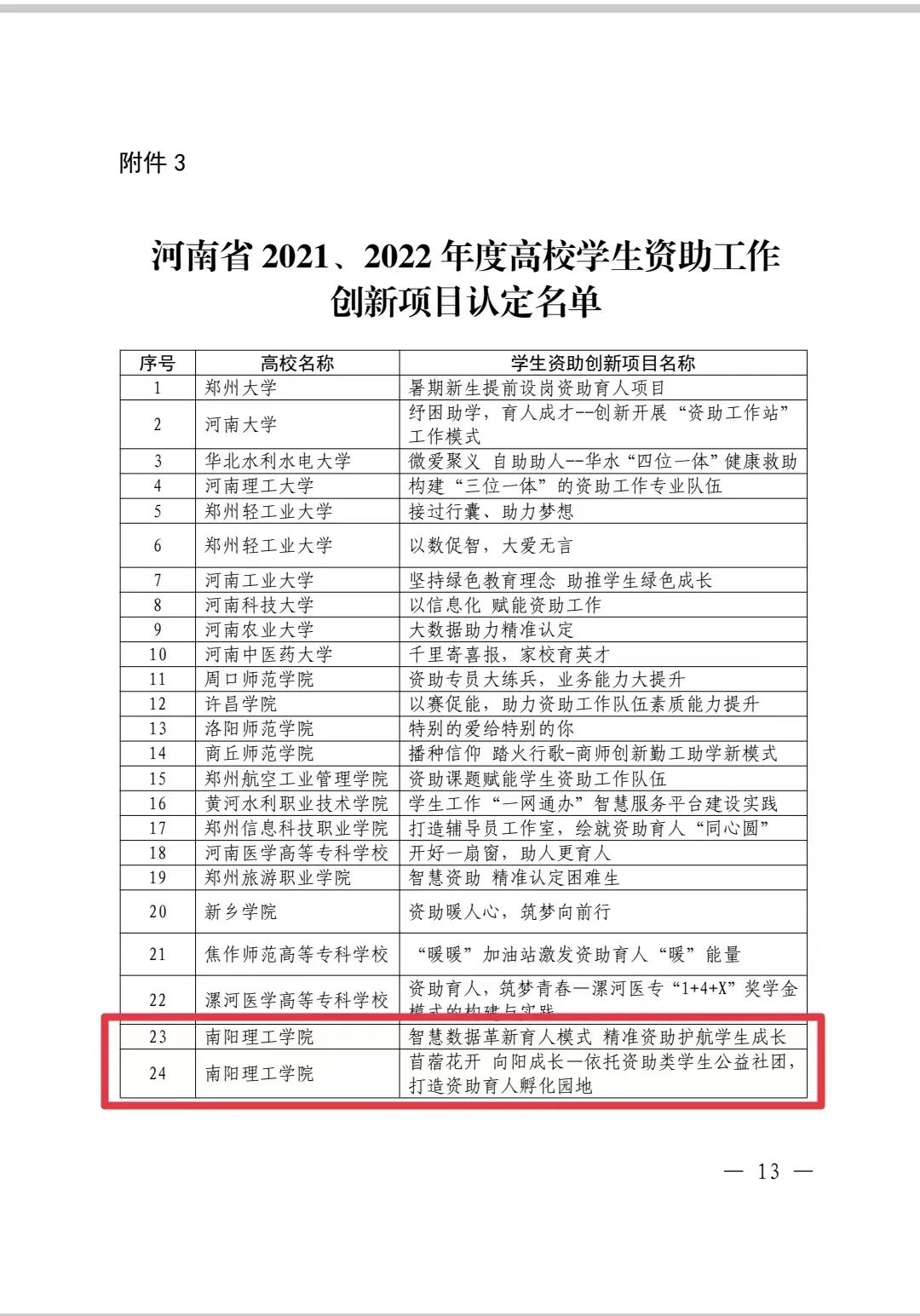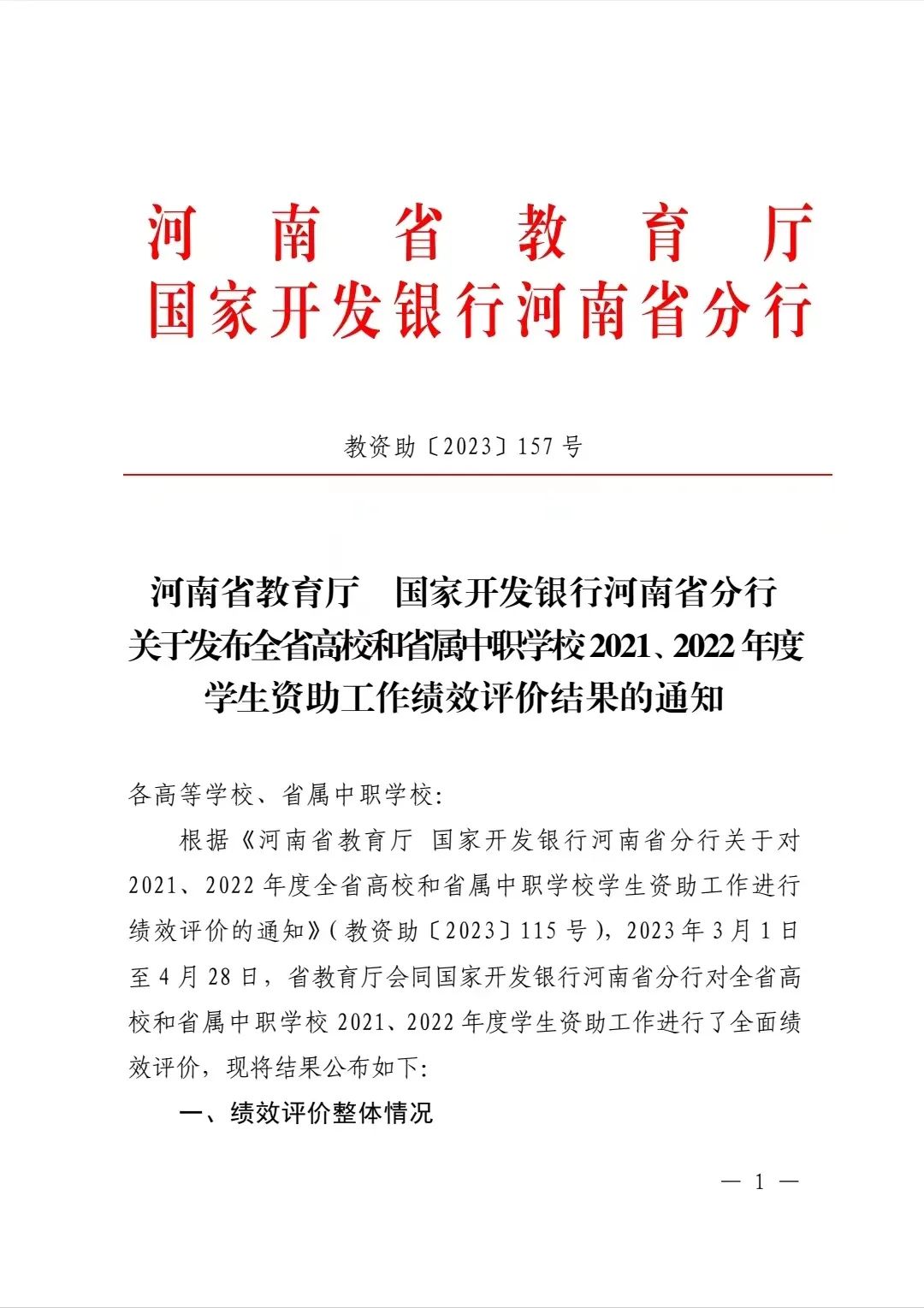 近日,河南省教育厅、国家开发银行河南省分行联合印发《关于发布全省高校和省属中职学校2021、2022年度学生资助工作绩效评价结果的通知》,我校成绩位列全省第七,再次被确定为优秀等级,这是自2005年开始考核以来,学校连续18年荣获“河南省高校学生资助工作绩效评价优秀”称号。同时,在河南省首届“学生资助工作创新项目”评选中,我校《智慧数据革新育人模式精准资助护航学生成长》《苜蓿花开向阳成长-依托资助类学生公益社团,打造资助育人精神孵化园地》两个项目在全省79个项目中脱颖而出,成功获评河南省学生资助工作创新项目。