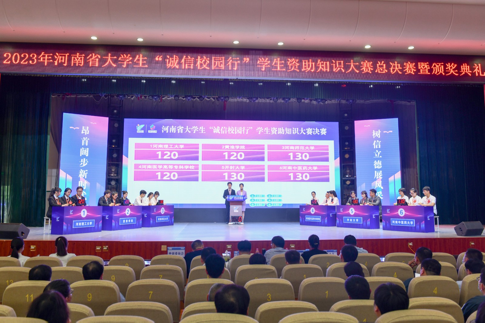 此次河南省大学生“诚信校园行”学生资助知识大赛以“昂首阔步新时代 树信立德展风采”为主题,自活动启动以来,全省高校积极响应、精心组织,参与学生190万余人次。全省156支高校代表队分7个分赛区,进行了49场复赛,36支队伍脱颖而出,跻身全省总决赛。
