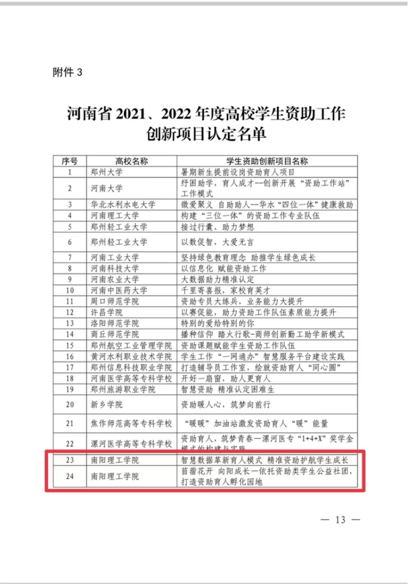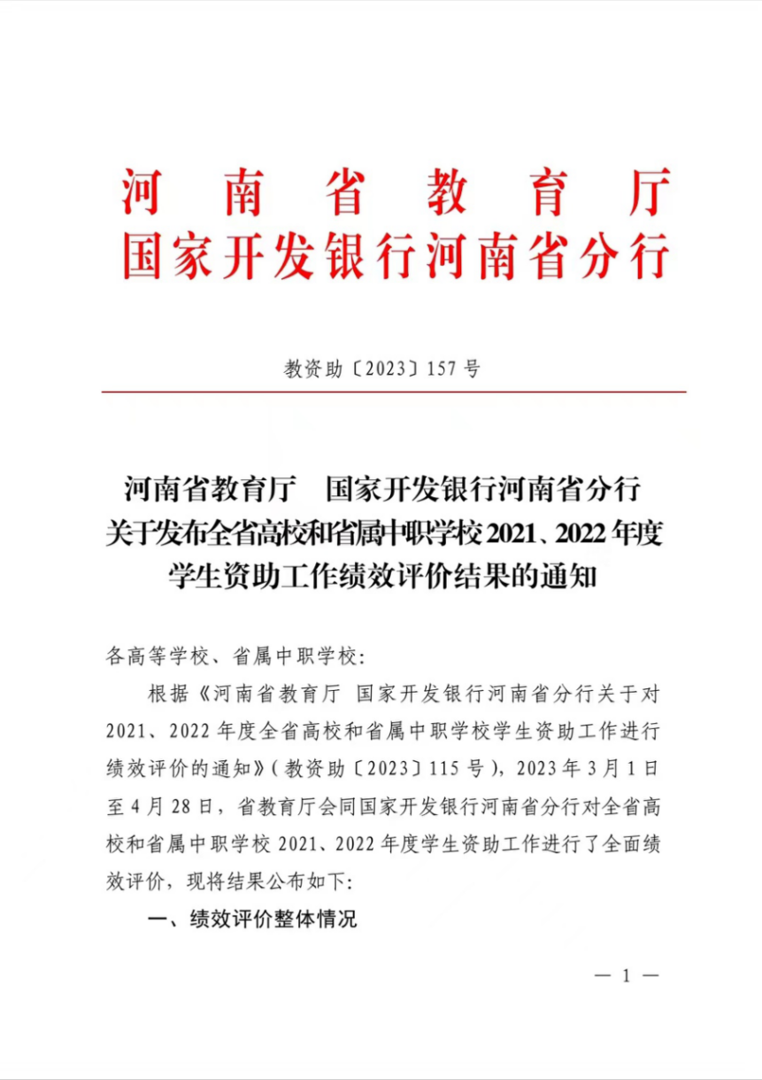 近日,河南省教育厅、国家开发银行河南省分行联合印发《关于发布全省高校和省属中职学校2021、2022年度学生资助工作绩效评价结果的通知》,我校成绩位列全省第七,再次被确定为优秀等级。这是自2005年开始考核以来,学校连续第18年荣获“河南省高校学生资助工作绩效评价优秀”称号。同时,在河南省首届“学生资助工作创新项目”评选中,我校《智慧数据革新育人模式精准资助护航学生成长》《苜蓿花开向阳成长-依托资助类学生公益社团,打造资助育人精神孵化园地》两个项目在全省79个项目中脱颖而出,成功获评河南省学生资助工作创新项目。
