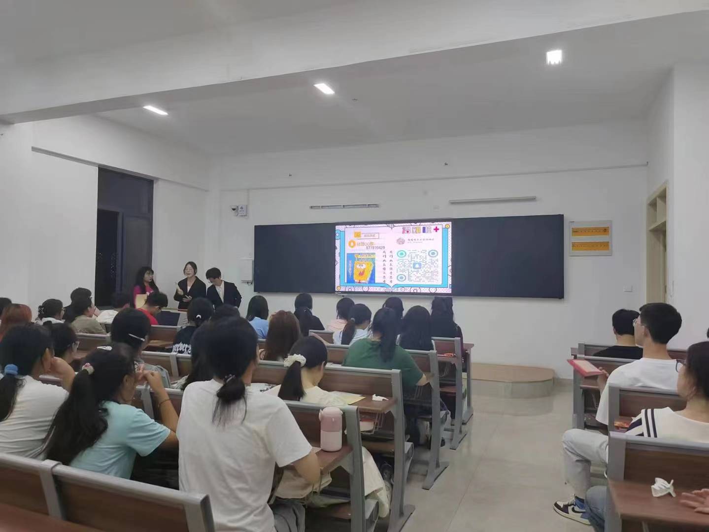 活动伊始,辩论队成员对辩论社团的背景、活动内容以及成员收获进行详细介绍,强调辩论对于学生个人成长发展的积极作用。随后,主讲人从发展历程、荣誉成就以及对成员的培养三个主要方面做进一步讲解。接着,主讲人结合视频短片,展现队员们在往届辩论赛中的精彩表现,给同学们留下深刻印象。互动环节,针对同学们的问题和困惑,主讲人耐心解答。