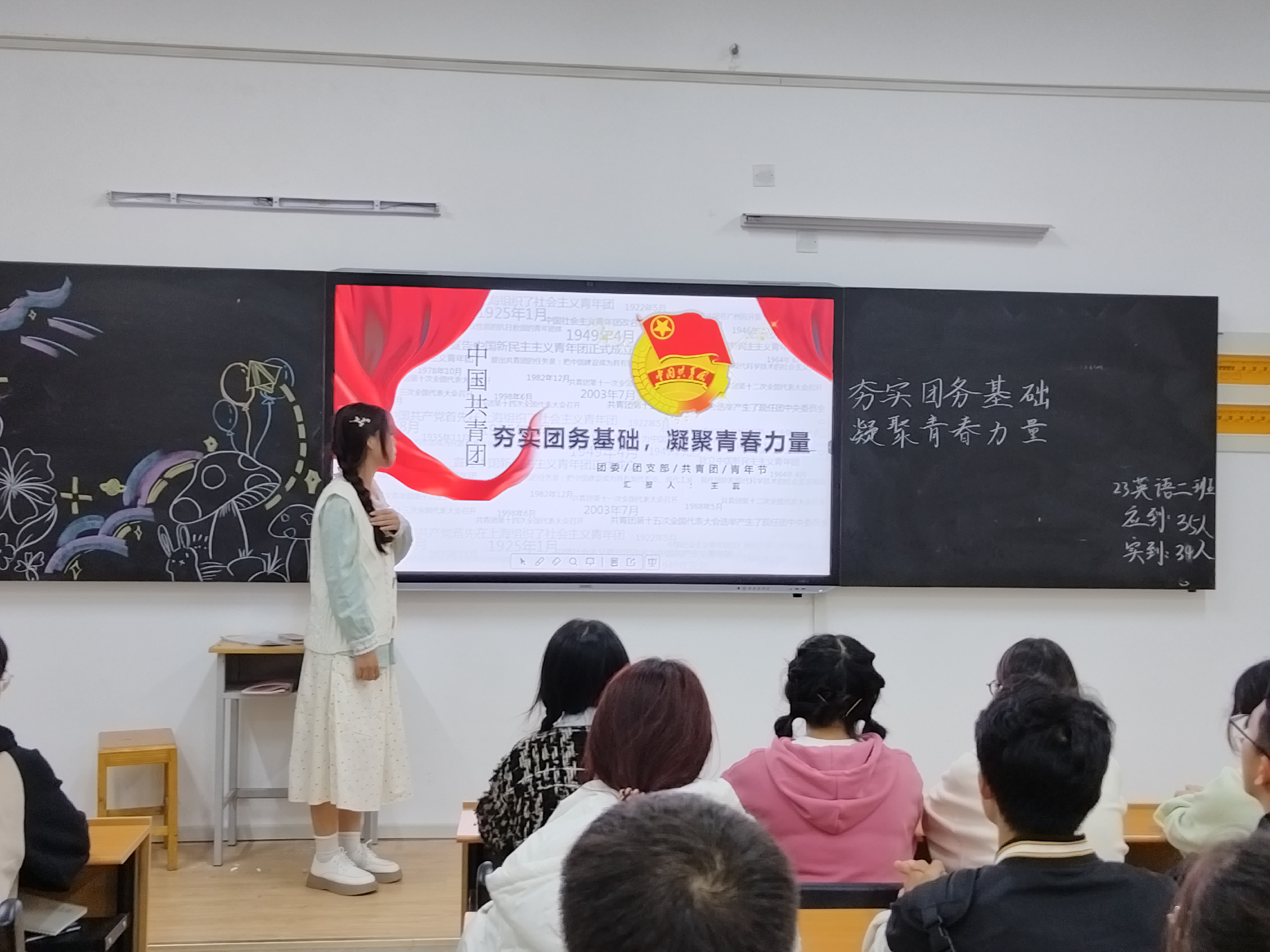 本网讯(通讯员/朱珠)为进一步加强基层组织建设,规范团支部工作,全面提升团组织力,10月11日,外国语学院于19号教学楼教室开展“夯实团务基础,凝聚青春力量”主题团日活动,本次团日活动由2022级商英一班董亚文主持,2023级全体同学积极参加。