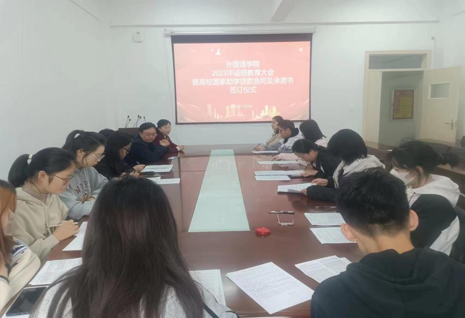 本网讯(通讯员/陈爽)为贯彻落实高校国家助学贷款政策,做好贷款合同审查与签订工作,加强对学生的诚信教育,引导学生诚信感恩,自立自强,11月8日,外国语学院在19教201室举办2023年诚信教育大会暨高校国家助学贷款合同、承诺书签订仪式。外国语学院党委书记赵万哲,党委副书记李爽正,资助专干尚明萱以及本年度贷款学生参加本次签订仪式。