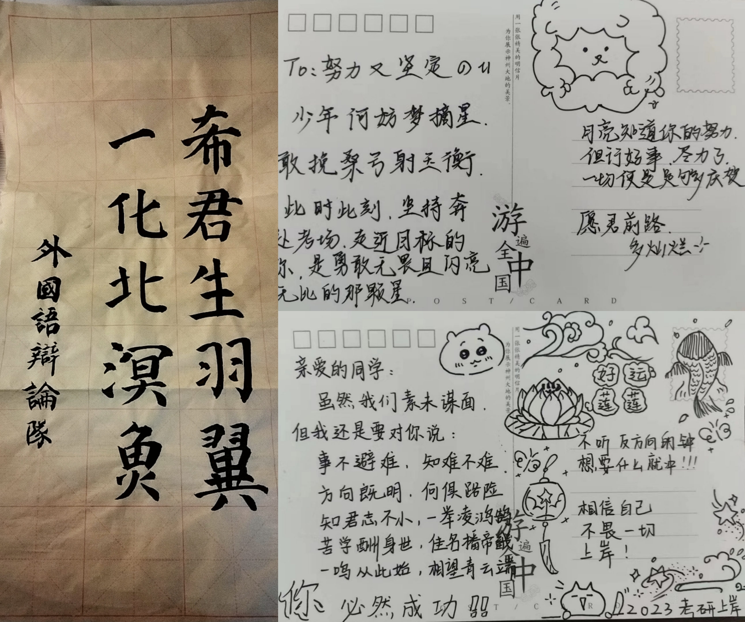 活动伊始,志愿者们准时到达地点进行准备工作,将包含着研究生招生考试所需文具的文具套装拆箱,并一一摆放整齐,以便于学子们领取。这套文具不仅是用心准备的礼物,也是对学子们辛苦付出的鼓励和肯定。低年级的同学们更精心准备了贺卡与小视频,用自己的方式为即将考研的学长学姐加油鼓劲,也展现出外国语学院学生之间的互助情怀。
