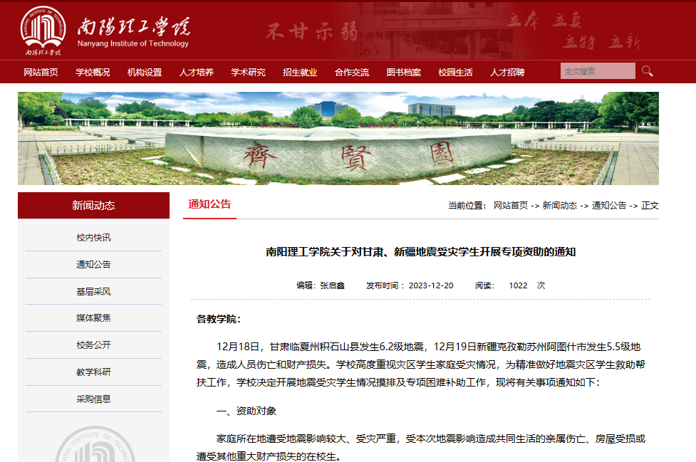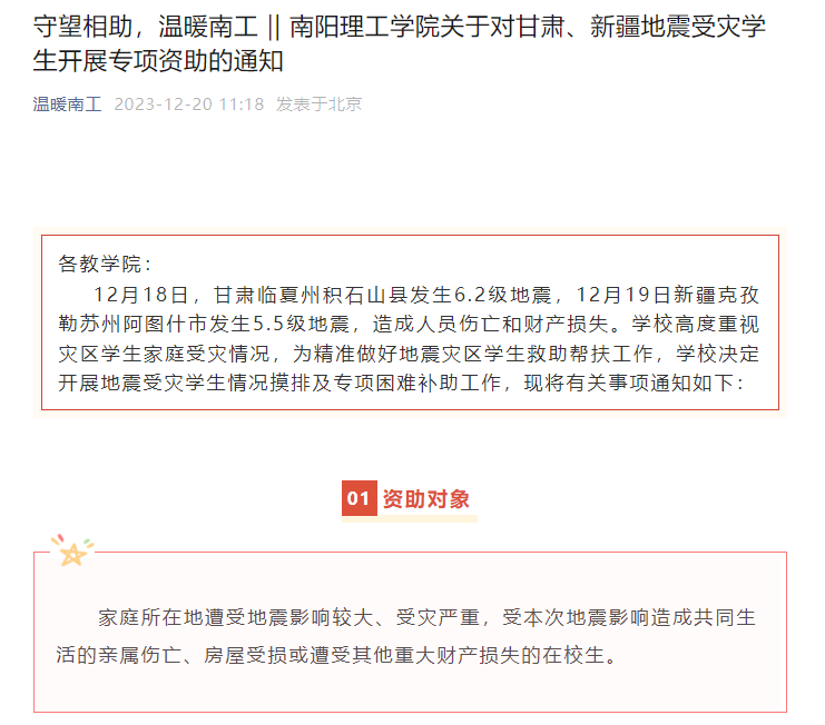 12月20日,学生资助管理中心在学校官网、温暖南工和南工学生工作在线公众号发布了《关于对甘肃、新疆地震受灾学生开展专项资助的通知》。受灾资助工作启动后,通过学生工作校院两级上下联动、多维协同的信息摸排网络和资助帮扶体系,依托学院辅导员,利用微信、QQ、电话、走访宿舍、谈心谈话等多种途径对全校567名甘肃、青海、新疆籍的同学详细摸排受灾情况,确保受灾学生全覆盖,信息准确、底数清楚。经统计与核准,全校确定首批受灾学生7人,每人1000元补助,合计7000元。为尽快发放受灾困难学生补助,学校简化申请审批程序,特事特办,实现高效资助,在精准摸排前提下,专门开通财务报销绿色通道,优先发放本次地震受灾资助资金,12月22日受灾学生专项资助已发放至学生银行卡中。