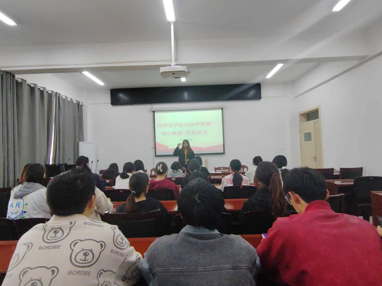 本网讯(通讯员/万秋园)为关怀家庭经济困难学生,帮助家庭经济困难学生解决实际生活困难,激励广大青年学子努力学习、锐意进取,3月29日,外国语学院于19教202室举行了2024年春期“爱心餐券”发放仪式。本次发放仪式由贾琦老师主持,外国语学院学生积极参加。