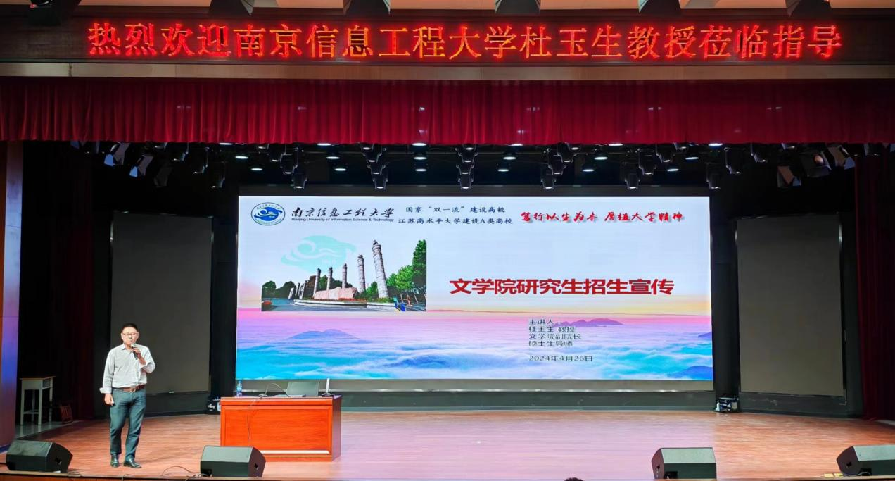 本网讯(通讯员/韩琳娜)为帮助学生坚定考研信念,缓解备考压力,明确学习目标,4月26日,外国语学院于21号教学楼演播厅开展考研主题讲座。本次讲座邀请了南京信息工程大学文学院副院长、硕士生导师杜玉生教授担任嘉宾主讲,外国语学院学生积极参与。