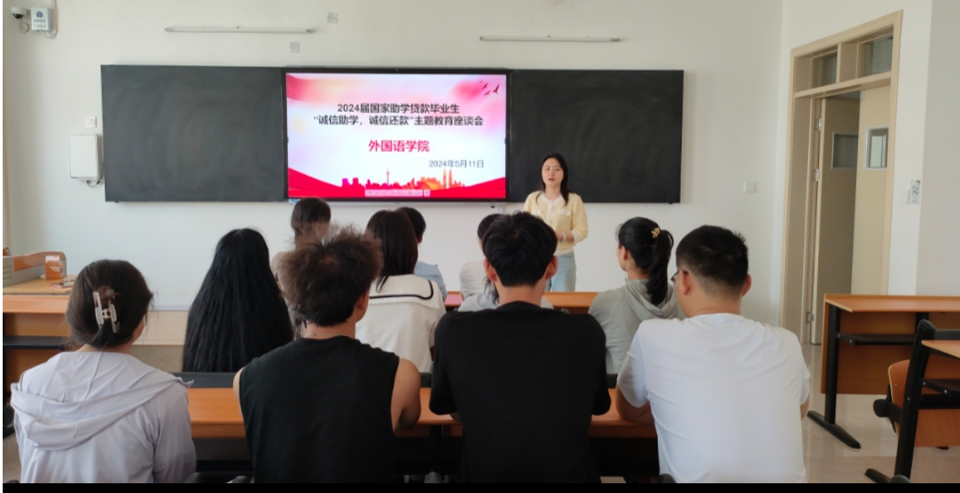 本网讯(通讯员/马心语)为全面贯彻落实国家资助政策,进一步强化助学贷款学生诚信教育,提高学生诚信意识和责任意识,5月11日,外国语学院资助站于19号教学楼601室开展2024届毕业生诚信还款教育座谈会。