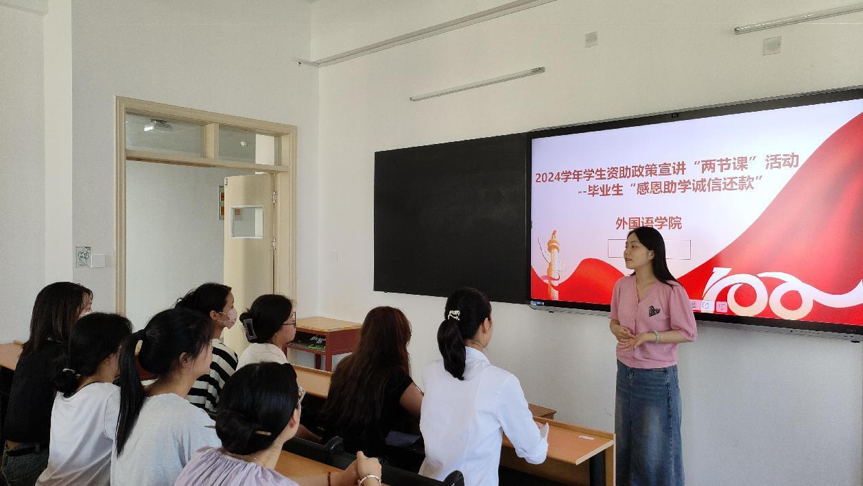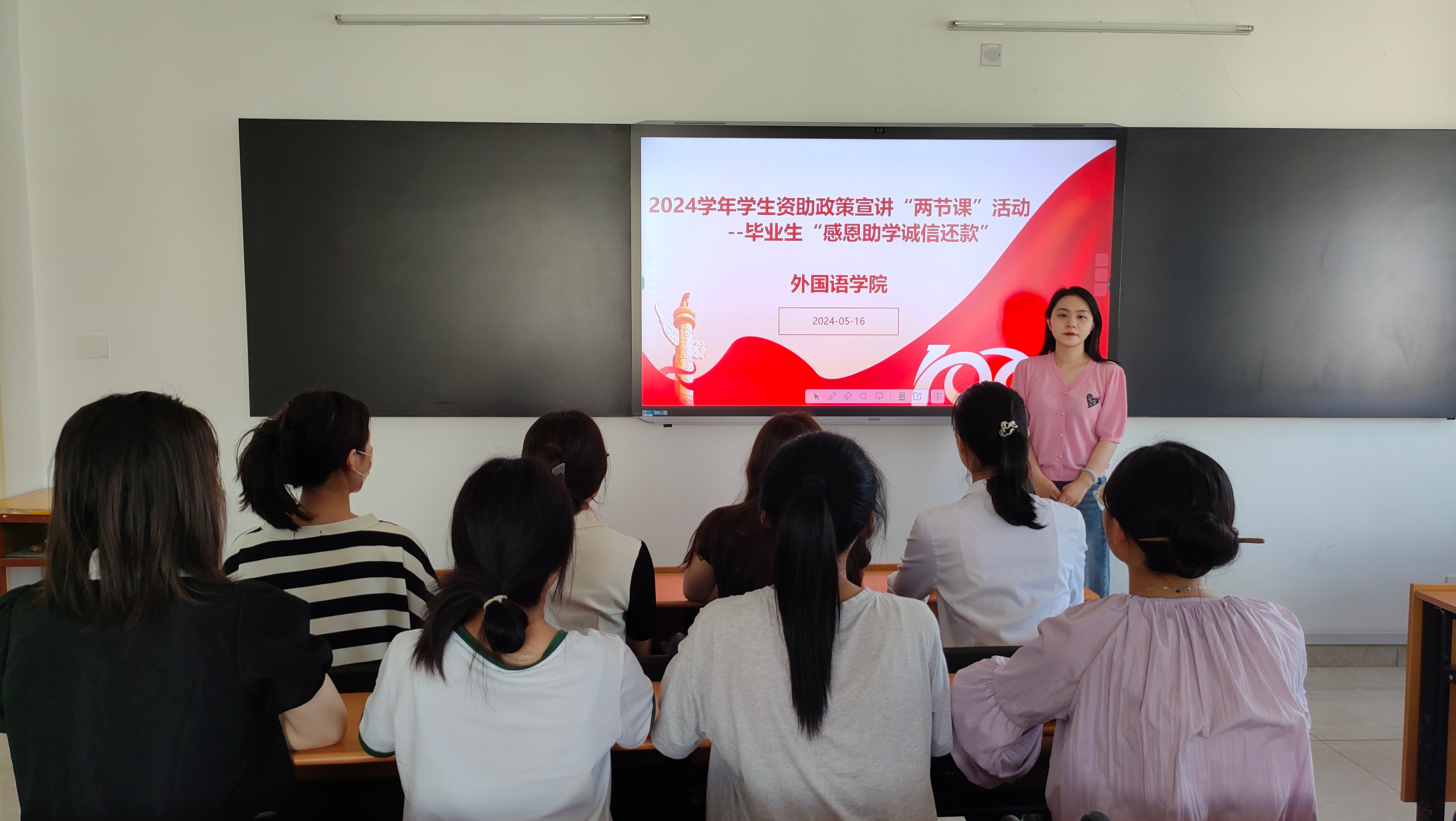 本网讯(通讯员/王颖)为贯彻资助育人的教育方针,落实毕业生助学贷款还款工作,加强诚信教育,5月16日,外国语学院于19号教学楼610室举办2024学年学生资助政策宣讲“两节课”—毕业生“感恩助学诚信还款”活动,此次活动由资助专干尚明萱主持,外国语学院2024届毕业生参加。