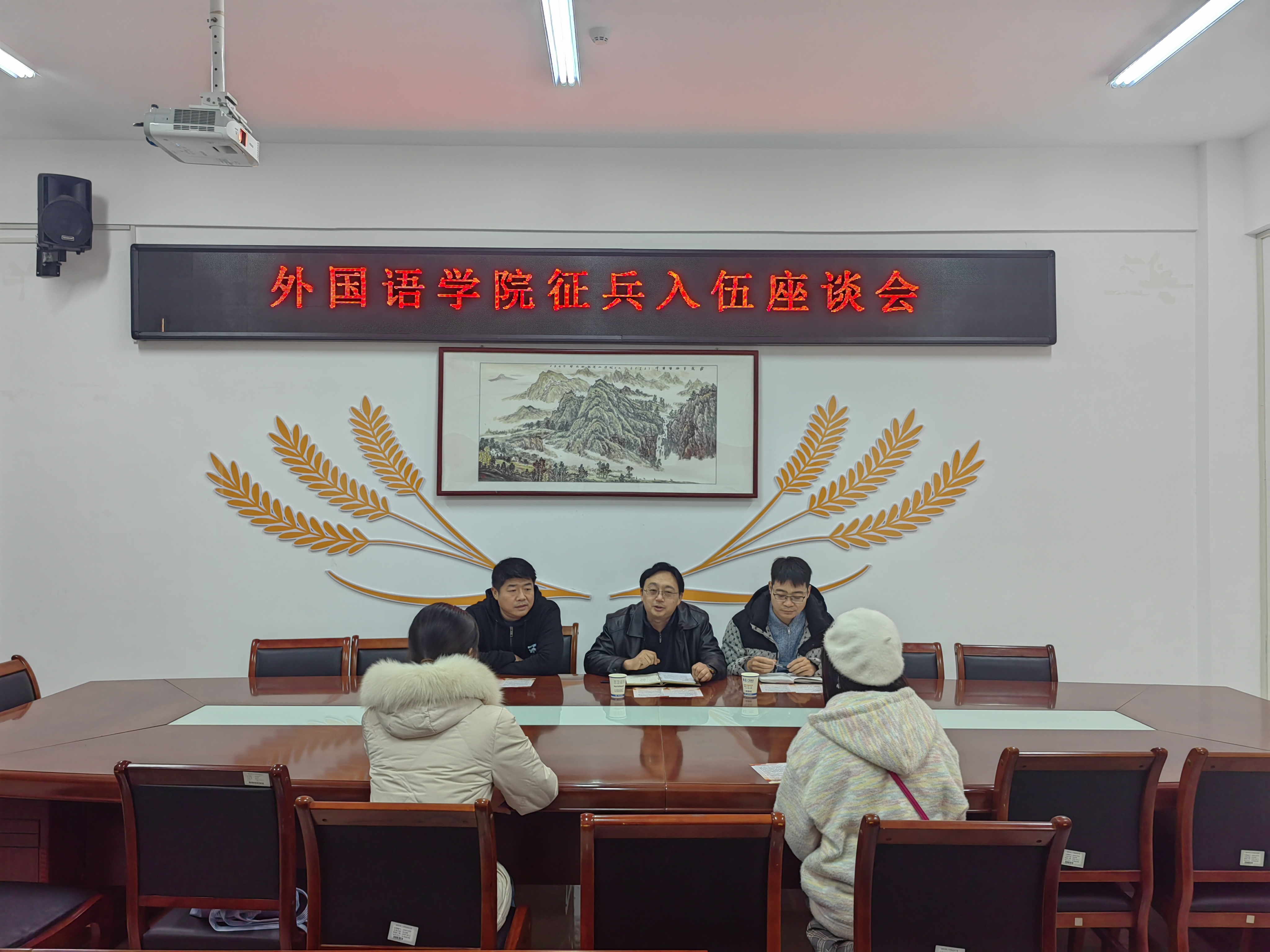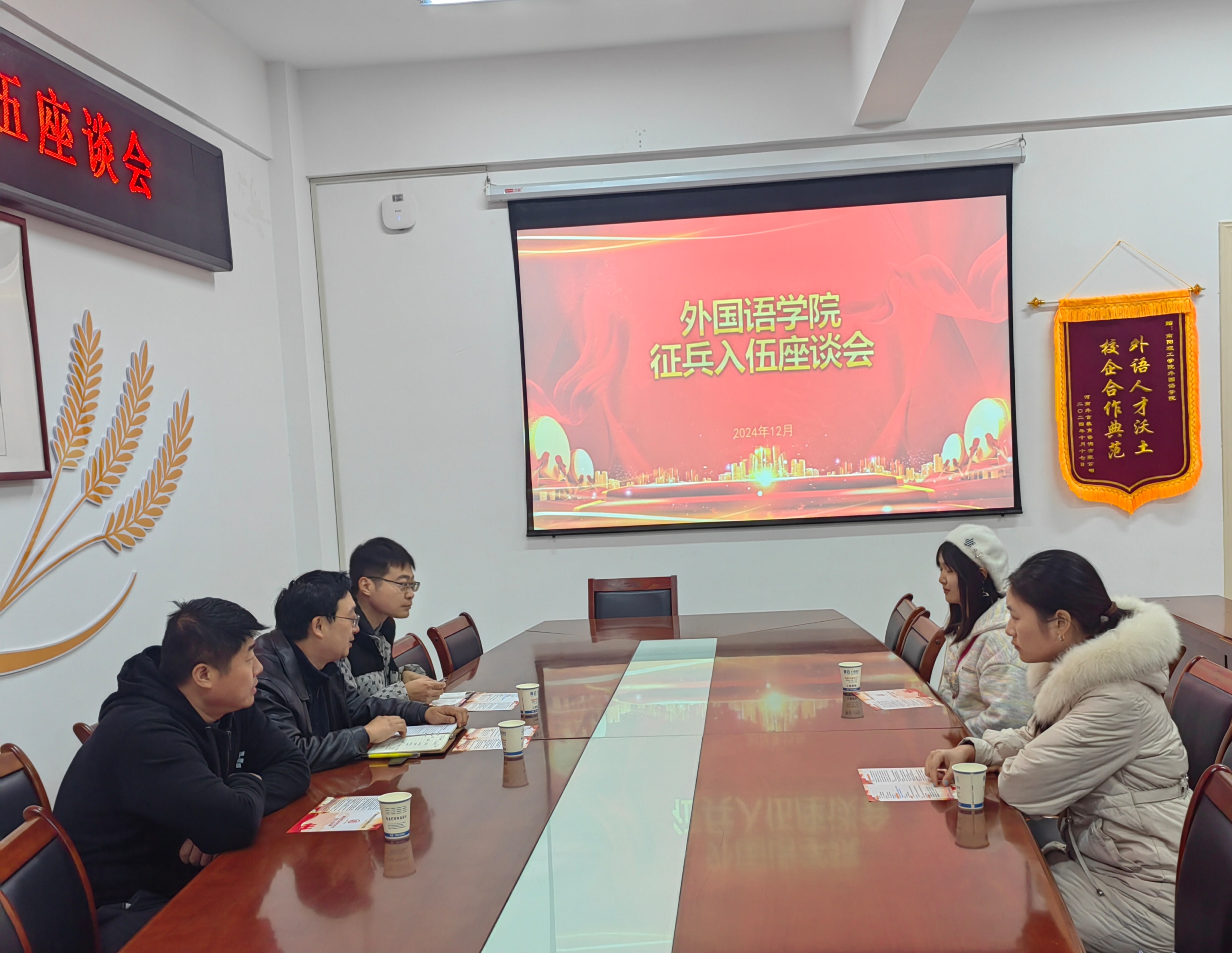 本网讯(通讯员/苏杭)为点燃学生们的参军热情,精准输送优秀外语人才投身国防建设,12月6日,外国语学院召开征兵入伍座谈会,本次会议邀请南阳理工学院国防教育与征兵办公室副主任周密主讲,外国语学院党委副书记李爽正,征兵专干李鹏飞及意愿入伍学生参加。
