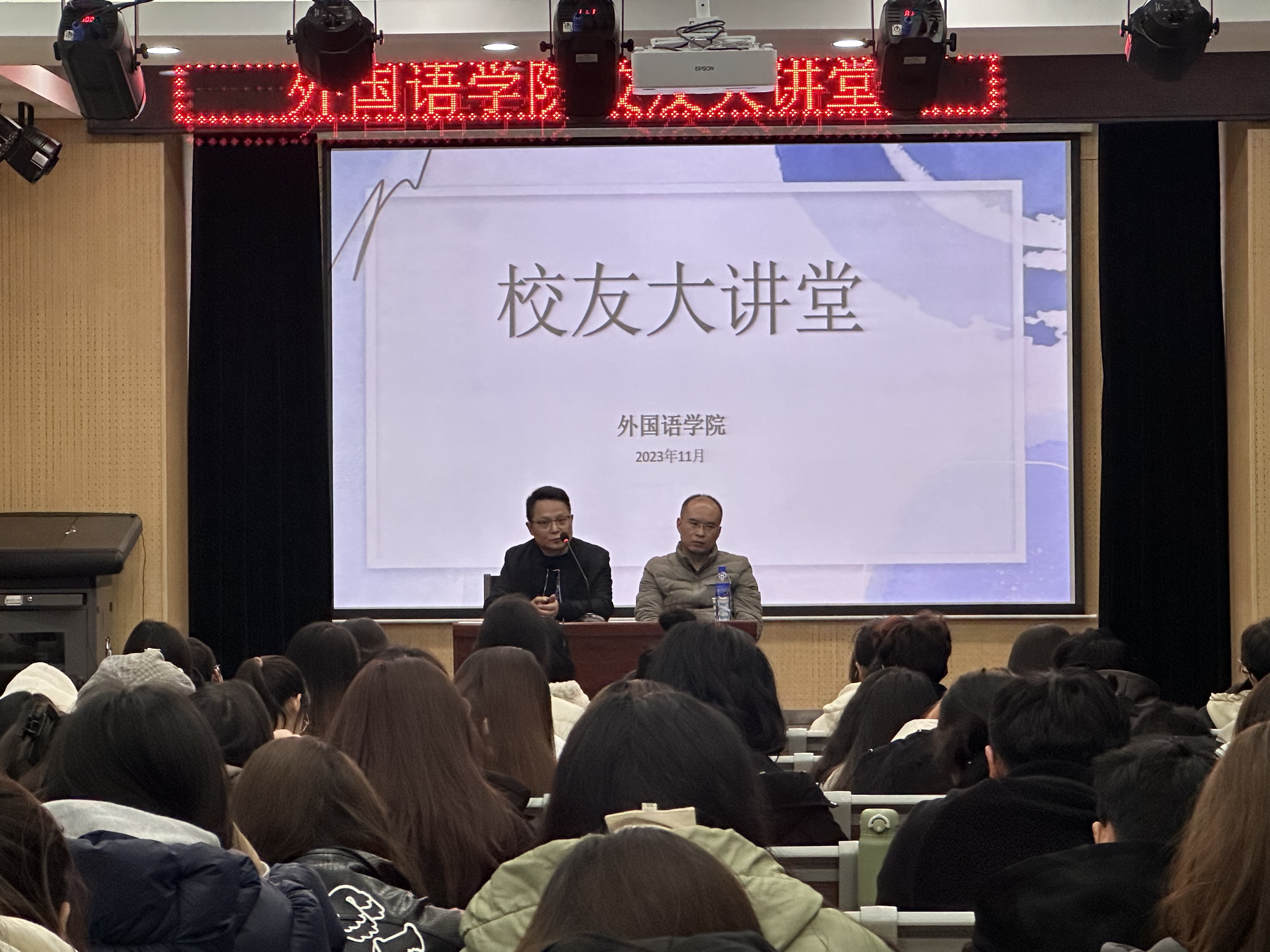 本网讯(通讯员/陈代棋)“少年辛苦终身事,莫向光阴惰寸功。”为进一步落实立德树人的榜样教育培育目标,营造外国语学院良好的学习氛围,11月14日晚,我校外国语学院于19号教学楼105教室开展了校友大讲堂。本次讲堂由李鹏飞主持,我校03级校友——深圳市德育华邦科技有限公司负责人傅维方以及潍坊腾翼珠宝贸易有限公司负责人滕广耀主讲。