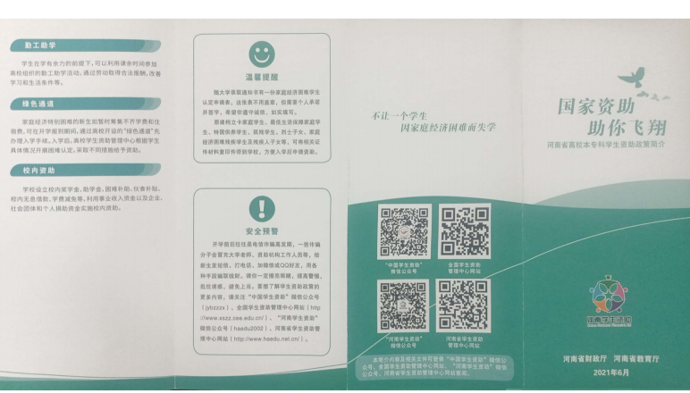 开学第一天,绿色通道为新生保驾护航。学院先通过报到前随录取通知书为每位新生寄送资助政策简介、开通学生资助热线电话、微信公众号宣传等形式,让新生提前清晰了解各项资助政策,做到了资助政策早宣传。接着,通过迎新系统主动摸排新生家庭情况,提前掌握原建档立卡家庭、低保、特困供养等特殊困难学生信息,确保不让一个学生因家庭经济困难而失学,彰显了信息渠道显关怀。