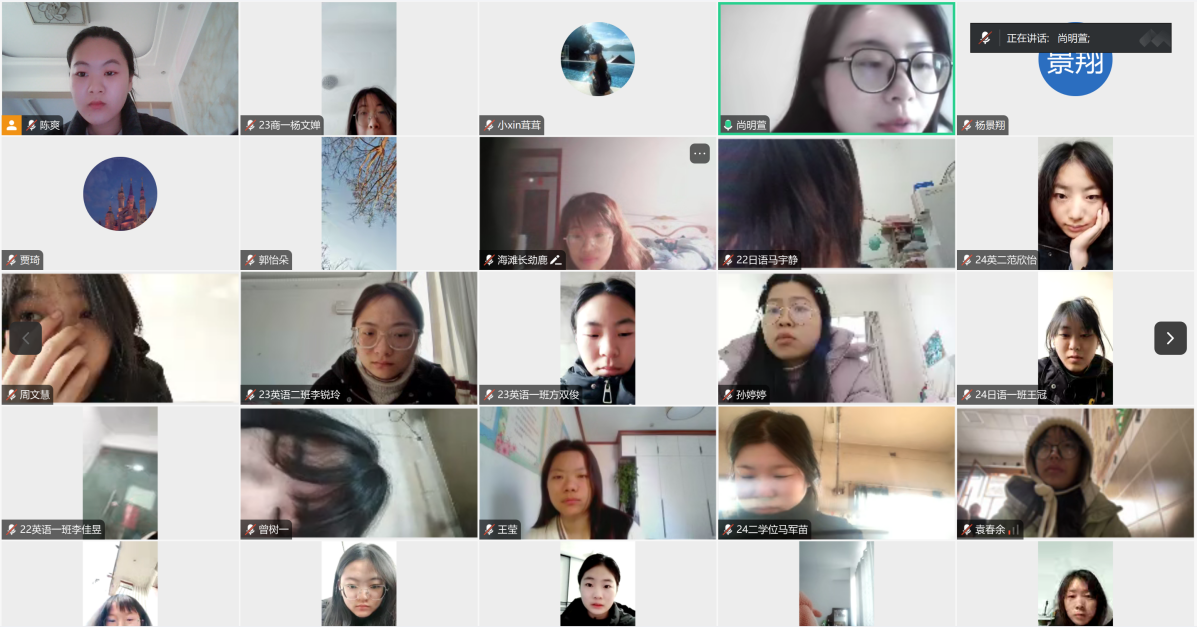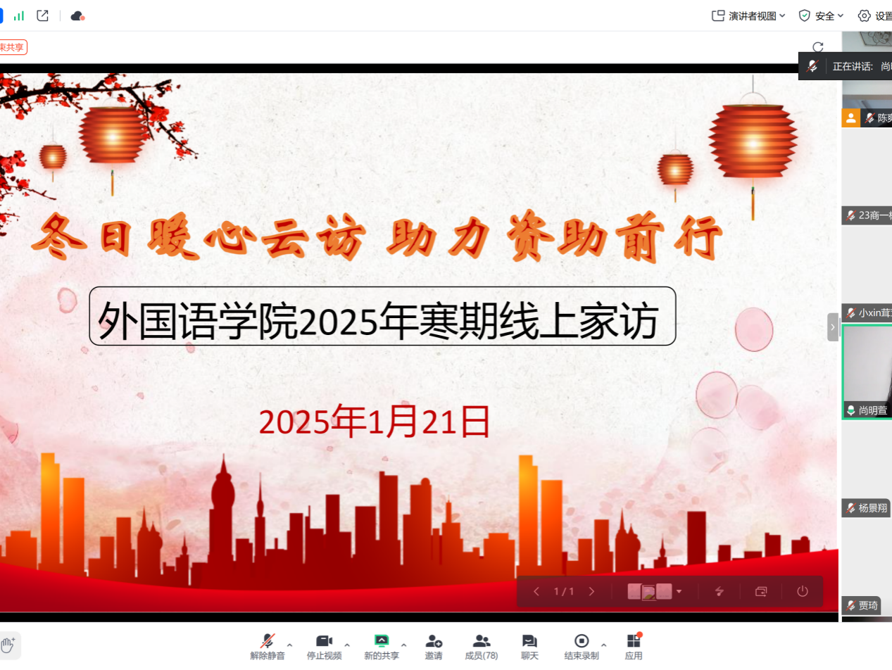 本网讯(通讯员/李艺凡)为深入贯彻落实国家和学校的资助政策,加强与受助学生的沟通交流,了解学生寒假在家的学习和生活情况,有针对性开展资助工作,1月21日,外国语学院开展2025年寒期线上走访活动,本次活动以线上腾讯会议的形式展开,资助专干尚明萱、2024级辅导员贾琦出席,国家助学金获得者参加。