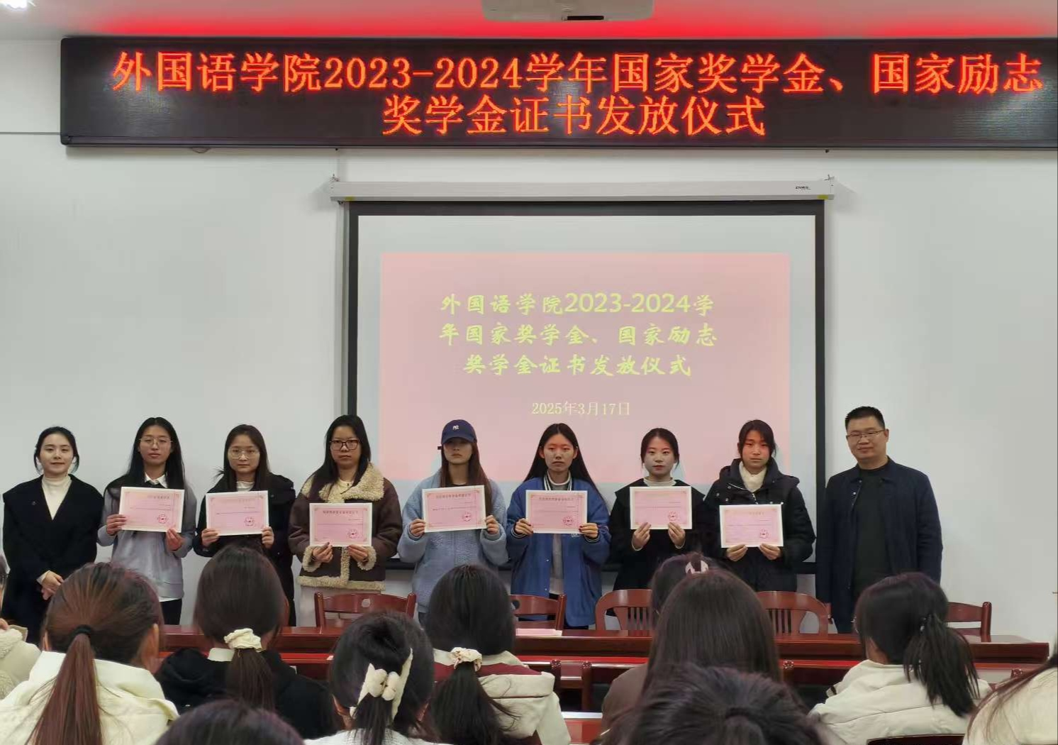 本网讯(通讯员/杨雅晴)为表彰先进,树立典型,3月17日下午,外国语学院于19教202会议室举办2023-2024学年国家奖学金、国家励志奖学金证书颁发仪式,外国语学院党委书记李新宁出席,资助专干尚明萱主持会议,国家奖学金和国家励志奖学金获得者参加。