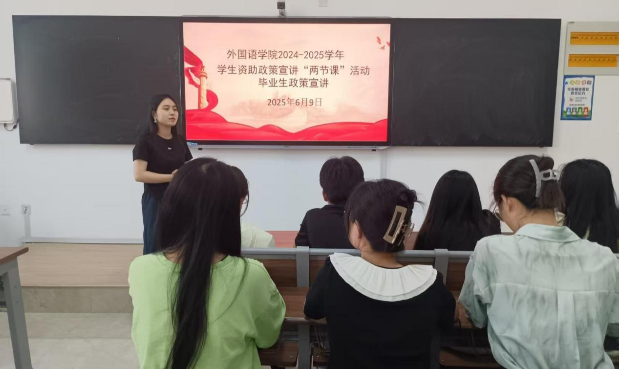 本网讯(通讯员/张俊佳) 为深入贯彻落实国家资助政策,强化毕业生诚信还款意识,6月9日,外国语学院在19号楼508室开展2024-2025学生资助政策宣讲“两节课”毕业生政策宣讲活动,本次活动由外国语学院资助专干尚明萱主讲,2025届毕业生踊跃参加。