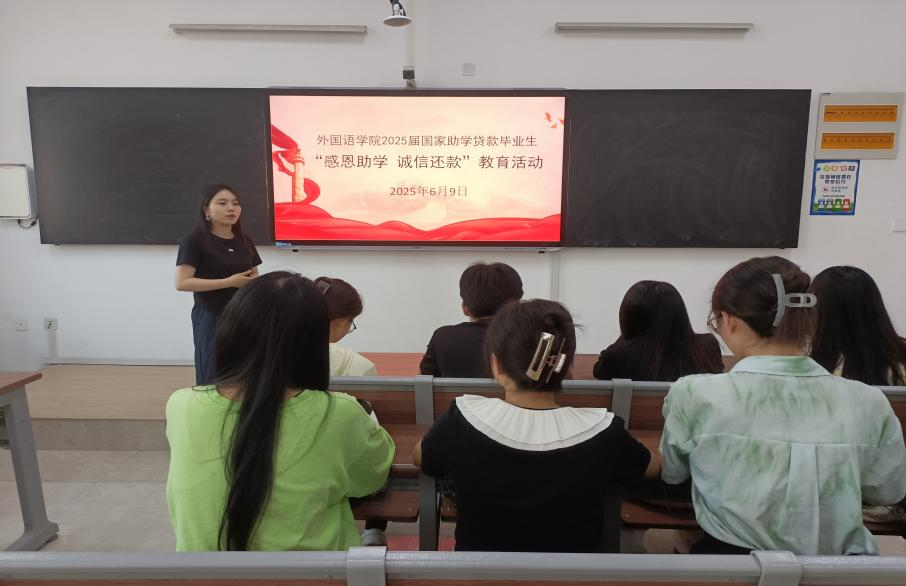 本网讯(通讯员/杨雅晴)为进一步落实国家资助政策,强化毕业生诚信还款意识,厚植感恩情怀,6月9日,外国语学院在19号楼508室组织开展2025届国家助学贷款毕业生"感恩助学,诚信还款"专题教育活动,本次活动由外国语学院资助专干尚明萱主讲,2025届毕业生参与此次活动。