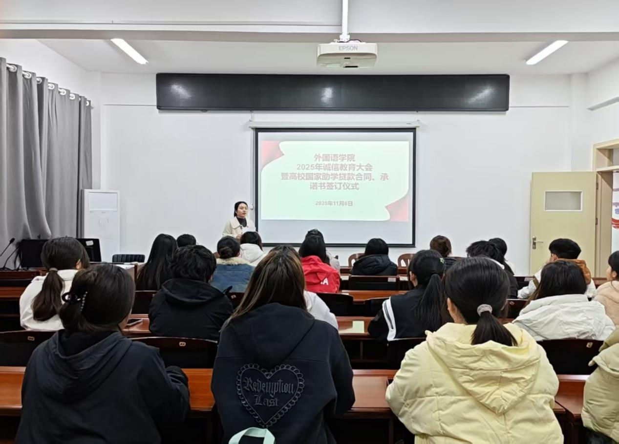 本网讯(通讯员/马莹莹)为强化学生诚信意识,确保国家助学贷款政策精准落地,助力家庭经济困难学生安心求学,诚信成长,11月6日,外国语学院在19教202举办2025年诚信教育大会暨高校国家助学贷款合同、承诺书签订仪式。学院资助专干尚明萱出席并主持本此会议,全体申请高校国家助学贷款的学生参会。