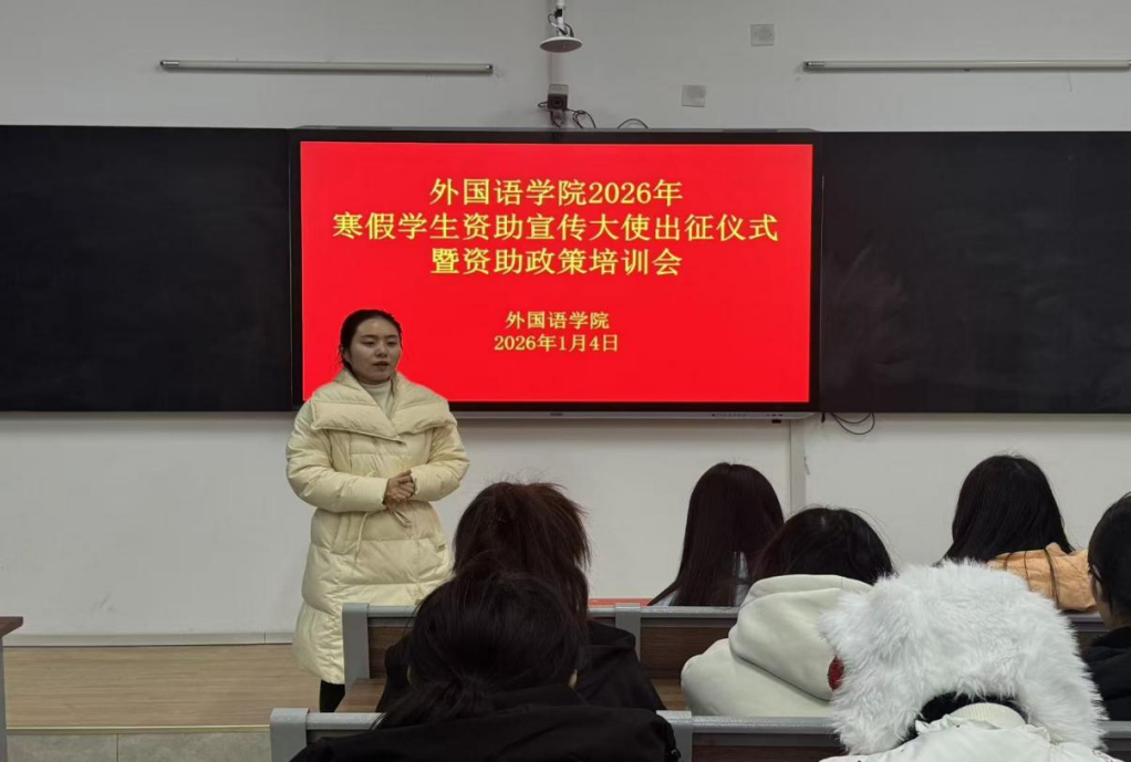 本网讯(通讯员/刘淑芬)为持续推进国家资助政策宣传,发挥先进学生的示范引领作用,引导学生从“受助”到“助人”的积极转变,1月4日,外国语学院于19教507举办2026年寒假学生资助宣传大使出征仪式暨资助政策培训会。本次培训会由学院资助专干老师尚明萱主持,全体资助宣传大使参会。