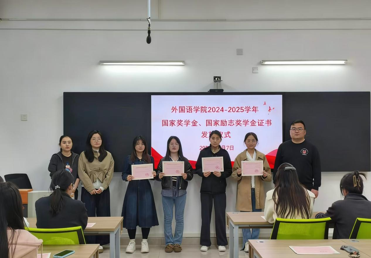 本网讯(通讯员/马莹莹)4月7日,外国语学院2024-2025学年国家奖学金、国家励志奖学金证书发放仪式在19教顺利开展。学生工作办公室主任孙健老师、资助专干尚明萱老师、2025级辅导员董倩纹老师出席仪式,全体获奖学生齐聚现场,共同见证荣誉时刻。