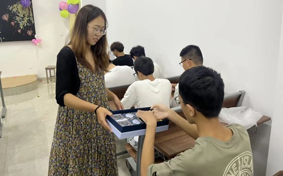 活动伊始,学院为同学们准备了各式各样、口味不一的月饼,由学长学姐们提前发往各班。活动现场热闹非凡,由同学们自行有序组织发放月饼,其中贾琦老师也来到现场参与为各班发放月饼活动。随后,贾琦老师为各个班级送上亲切的问候和鼓励的话语,与同学们一同度过中秋节。此外,同学们准备了有趣的节目和相关视频,大家一起观看,为此次活动增添了节日的欢乐氛围。活动最后,同学们与贾琦老师共同举起月饼合影留念。