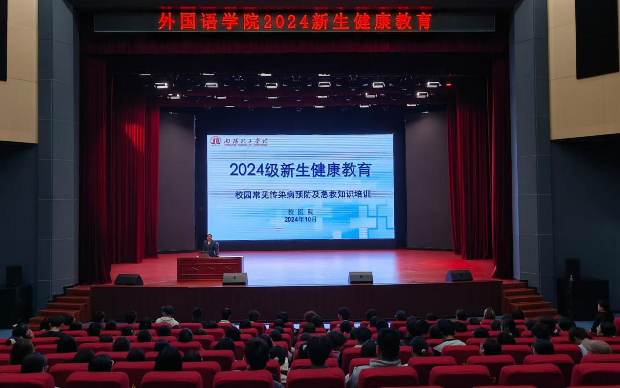 本网讯(通讯员/何赛菲)为增强学生们的安全卫生防治意识,提高自我保护能力,10月24日,外国语学院于东校区音乐厅开展“传染病防治”讲座。本次讲座由校医院负责人耿蕊主讲,外国语学院2024级新生全体参与。