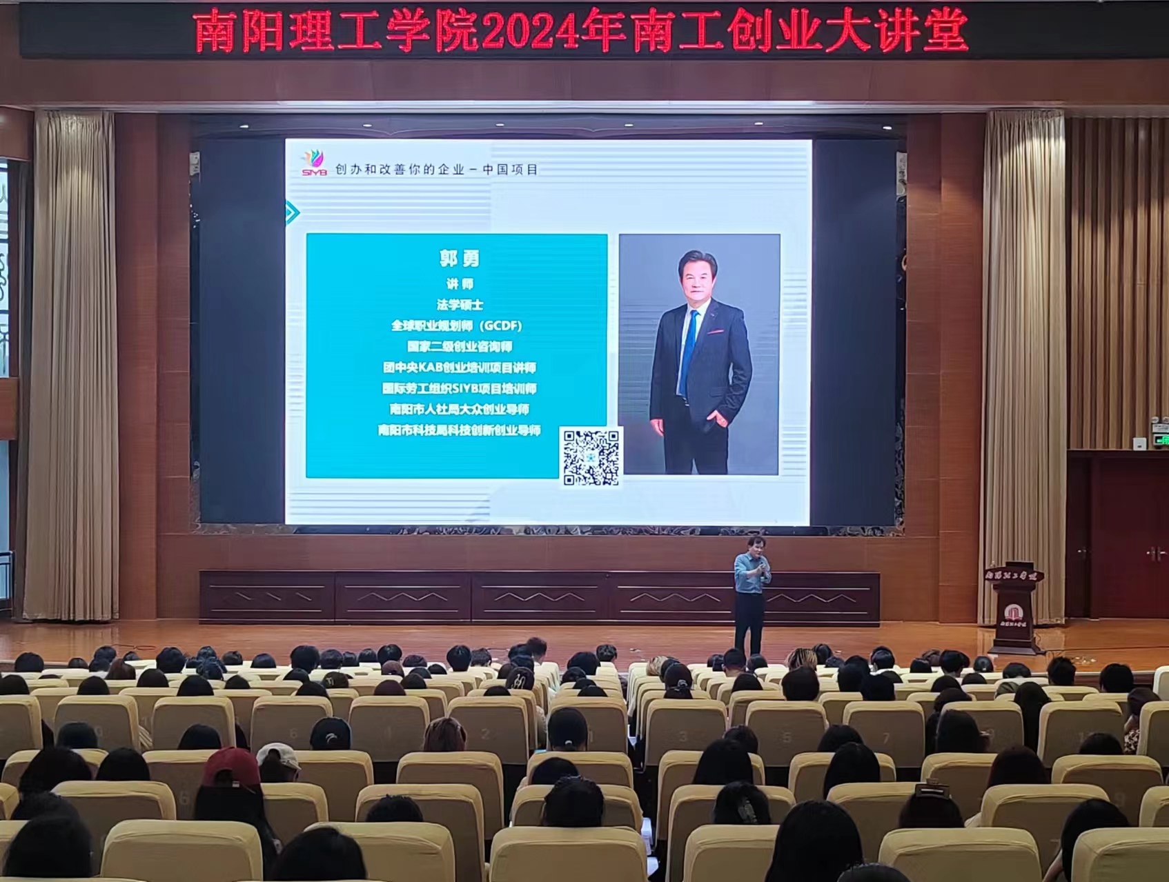 本网讯(通讯员/金韫仪)为了进一步加强外国语学院同学关于创业就业市场现状的了解,拓宽学生就业思路,树立正确的多元的就业观,5月15日,外国语学院于第三报告厅开展创业大讲堂讲座,特邀南阳理工学院资深创新创业导师郭勇老师进行分享。