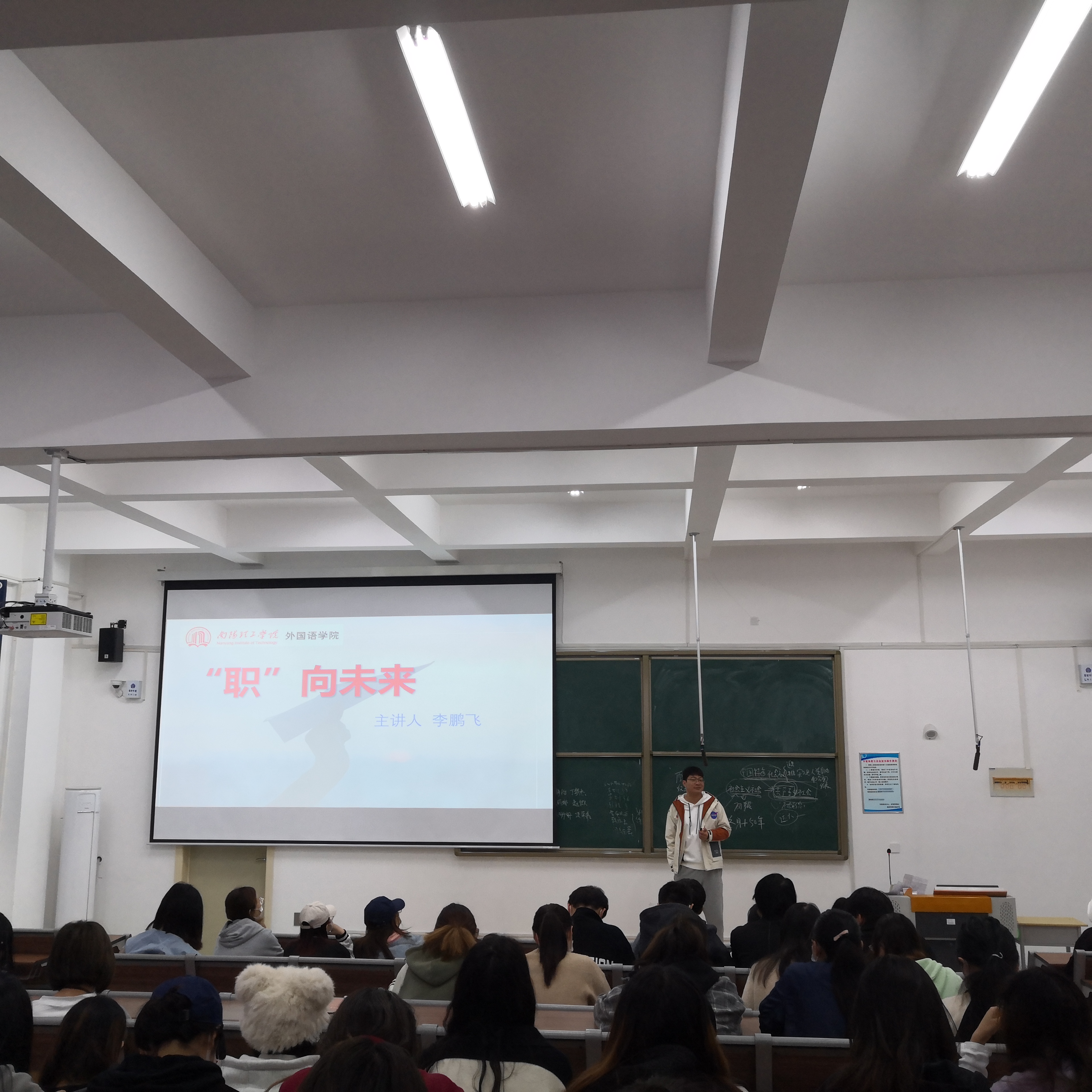本网讯(通讯员/王硕)为帮助2023届毕业生了解就业形势,明确就业方向,10月27日,外国语学院于23号教学楼102室举办“‘职’向未来”就业讲座。本次讲座由19级辅导员李鹏飞主讲,19级全体学生参加。