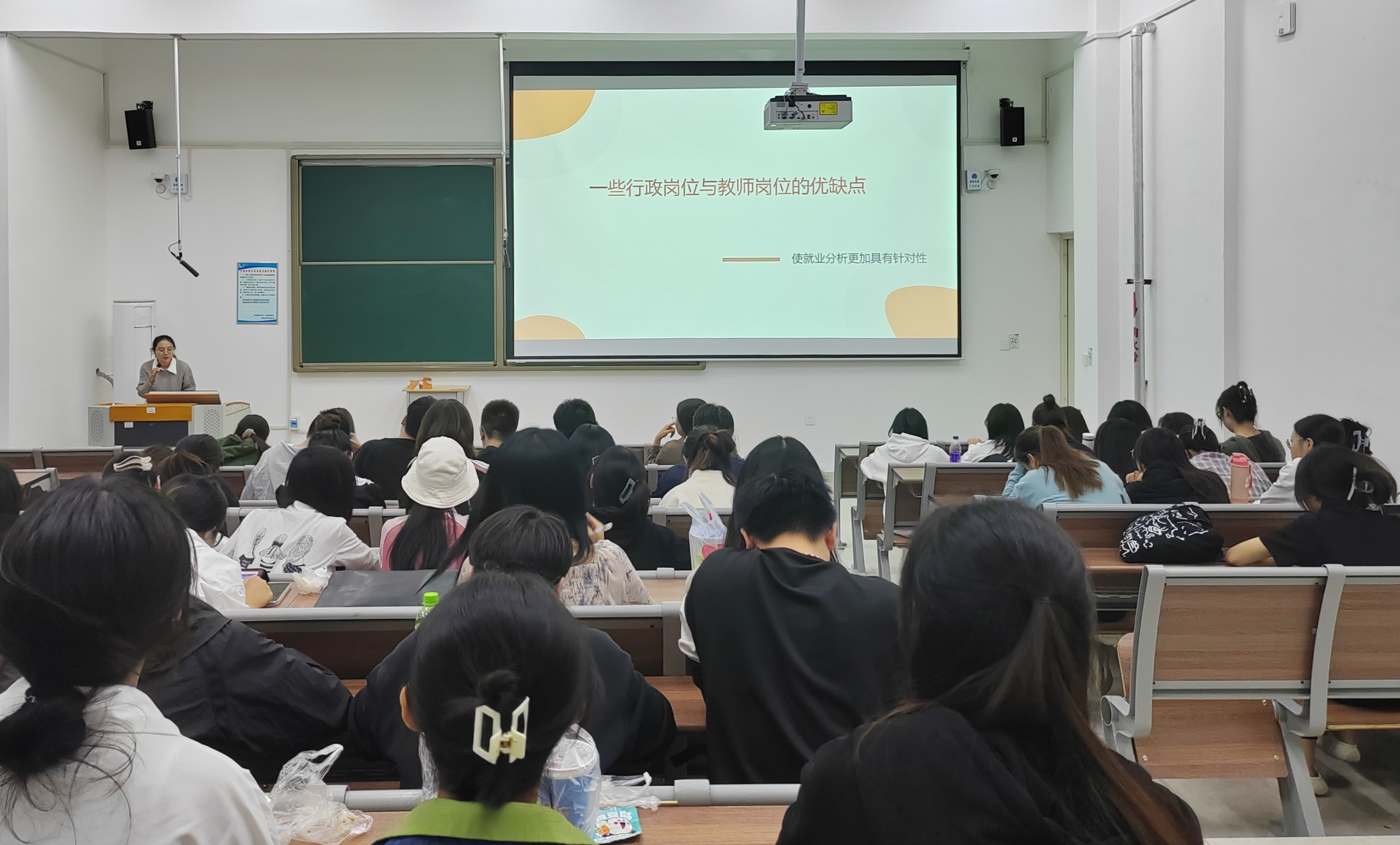 讲座伊始,尚明萱老师通过幻灯片,引出就业岗位选择的话题,分享了关于当前就业市场不同行业的前景和发展方向,并就行政岗位与教师岗位的优势与劣势着重分析。接着,尚明萱老师指出,同学们要准确定位自己的职业目标岗位,学会运用“新木桶理论”来实现自我认知与兴趣探索,瞄准起步方向,同时要勇于尝试新的事物,这样才能在自己的求职道路上走得越来越远。最后,尚明萱老师对本次讲座进行总结,她表示,希望同学们不仅要善于发现自身优势,还要保持良好心态,确保自己能在就业道路中走得长远。