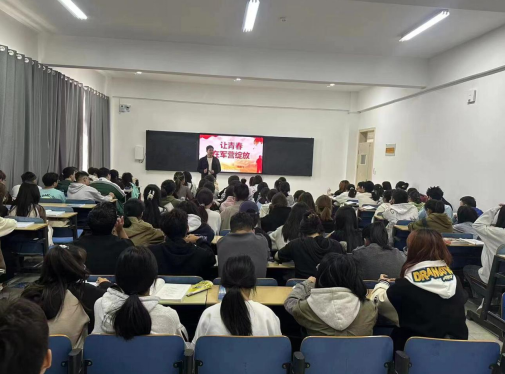 活动伊始,李鹏飞以国际形势的不断变化为引,指出大学生入伍不仅是新形势下加快国防和现代化军队建设的重大举措,也是实现强国梦、强军梦的重要措施。随后,李鹏飞详细解释参军入伍对同学们升学考学、就业上岗以及考公考编等多方面优惠政策,并就参军入伍的报名方法和注意事项进行介绍。接着,李鹏飞以往年优秀退伍学生为例,进一步指出参军入伍的优势,同时组织同学们进行互动交流,并对问题进行作答,整个现场气氛十分热烈。最后,李鹏飞做出总结,呼吁同学们树立携笔从戎、报效祖国的成才之志,把爱国之心化为报国之行,为我国军队建设贡献青春力量。本次活动圆满结束。