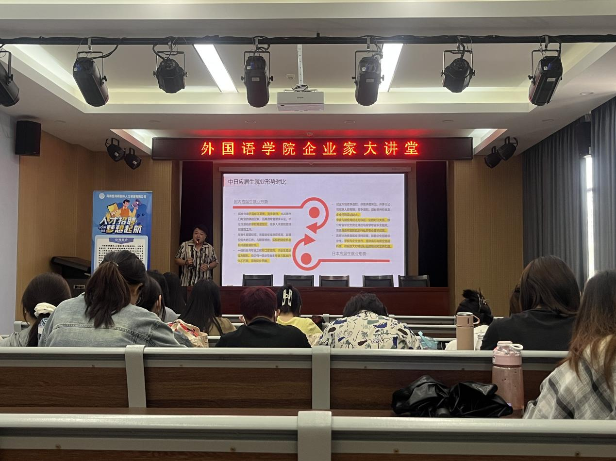 本网讯(通讯员/史文静)为充分做好我院毕业生的实习就业工作,共同搭建学校与企业间沟通、合作的桥梁,增加学生对未来就业情况的了解,5月21日,外国语学院于19号教学楼105教室举行企业家大讲堂,本次大讲堂由河南信润得国际人力资源公司企业负责人主讲,日语专业全体学生积极参加。