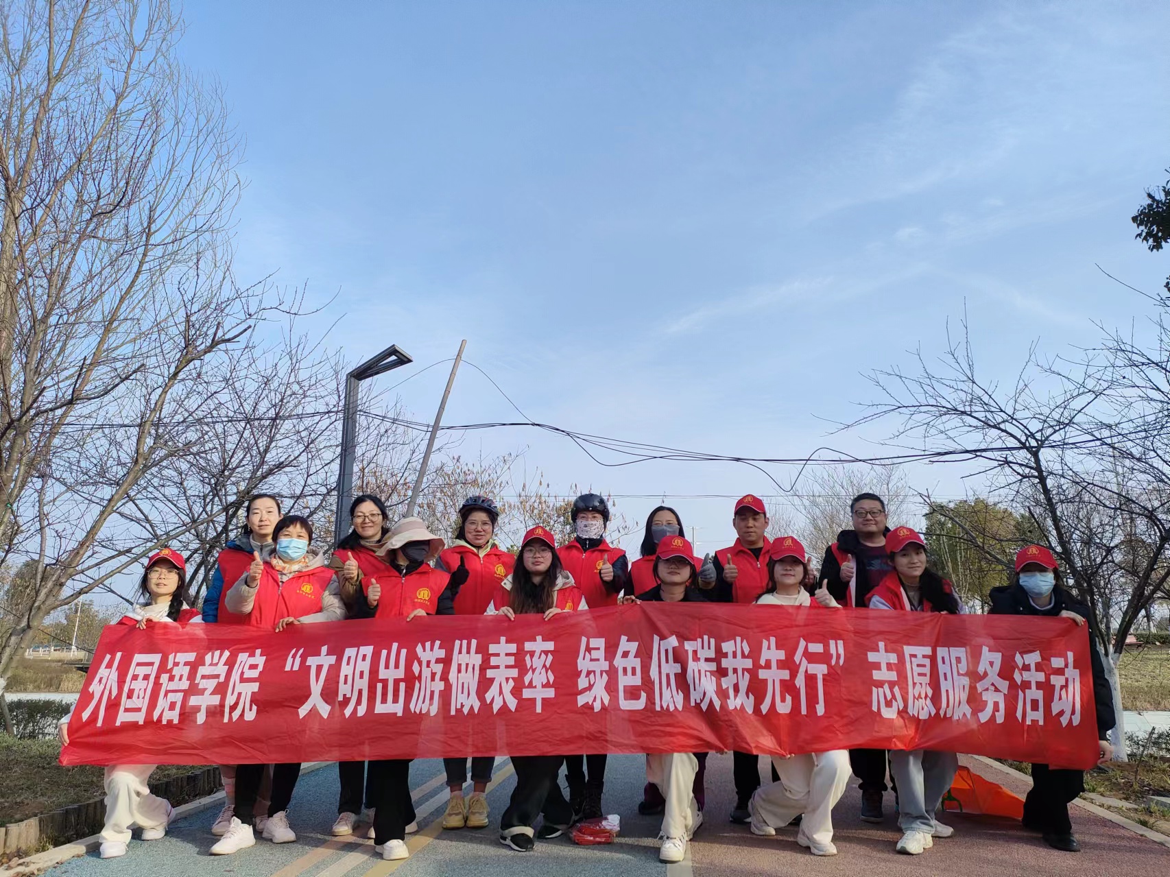 本网讯(通讯员/赵慧)为推广和倡导绿色出行理念,培养绿色低碳的生活习惯,同时锻炼身体、增强体质,外国语学院于3月8日下午组织开展了以“文明出游做表率,绿色低碳我先行”为主题的志愿服务活动,共25名师生参加。