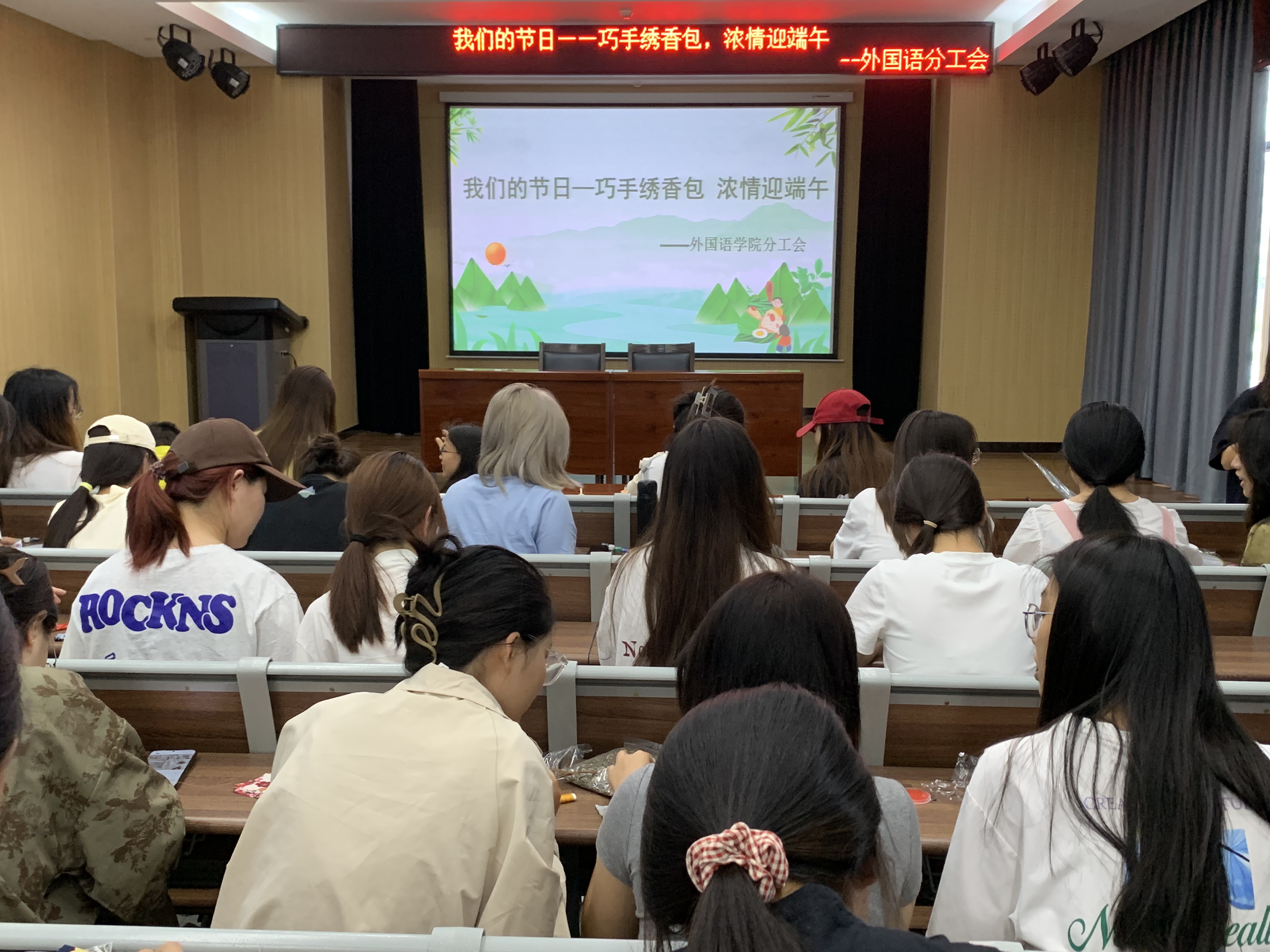 本网讯(学生通讯员/谢传月)在端午佳节即将到来之际,为弘扬中华优秀传统文化,丰富校园文化生活,外国语学院分工会于6月4日下午在19教105开展以“我们的节日——巧手绣香包,浓情迎端午”为主题的活动,外国语学院师生积极参与。