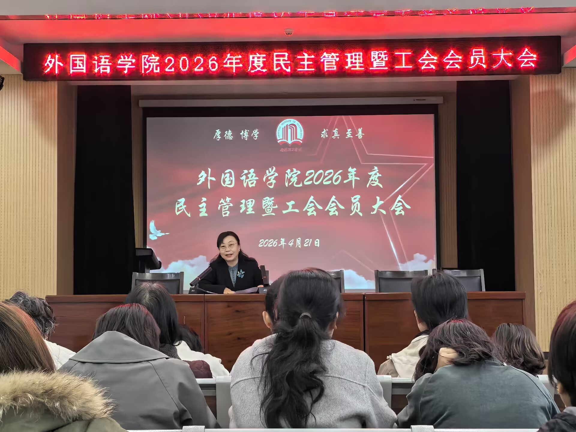 会议指出,此次大会是一次统一思想、凝聚共识、鼓舞干劲、共谋发展的大会。全院教职工要以此为契机,进一步强化责任担当、凝聚奋进力量,紧扣2026年目标任务,立足岗位、真抓实干,在学科建设上求突破,在人才培养上提质量,在教学科研上出成果,在社会服务上显担当,在分工会建设上聚合力,共同推动外国语学院内涵式发展、智能化转型再上新台阶,为学校建设特色鲜明的高水平应用型大学积极贡献外语力量。